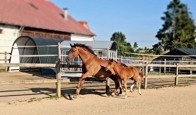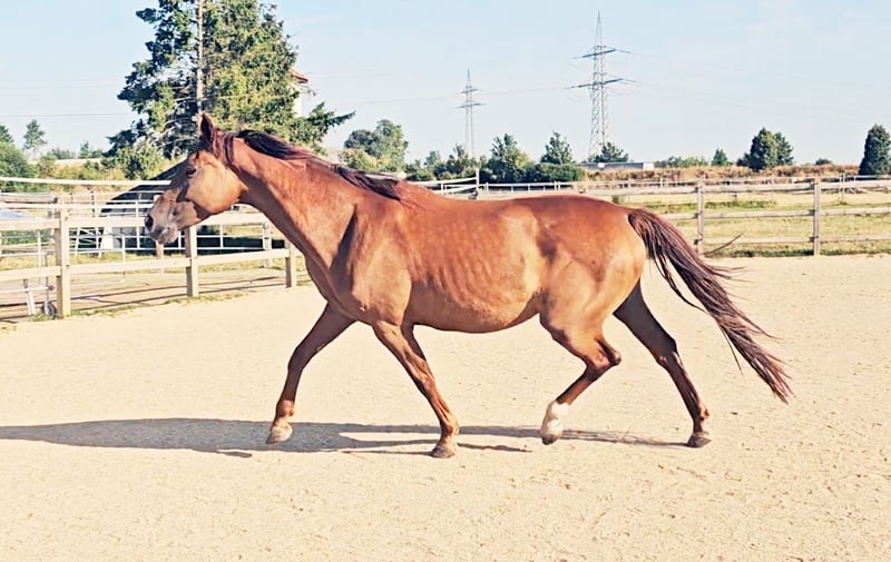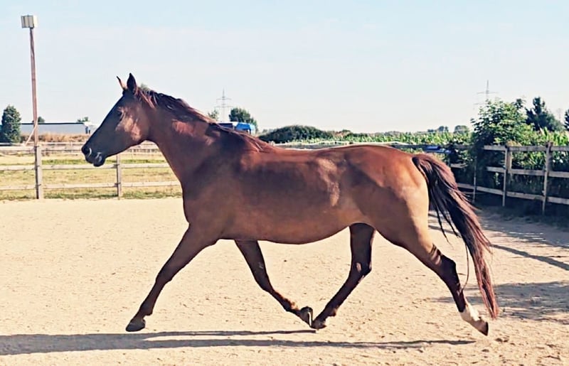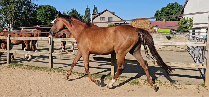 À vendre uniquement en raison de l'abandon de l'élevage en raison de la maladie de l'éleveur (Exclusivement dans des mains aimantes et appréciatives et dans un foyer de premier ordre) - Jument Holsteiner de 5 ans - Alezan foncé (seulement une robe de gris, pas de gris !) - Déjà primée en tant que poulain - Les deux parents ont réussi jusqu'à la classe supérieure en dressage et en saut d'obstacles Super pedigree Ascendance paternelle : Topas - Totilas - Gribaldi - Sandro Hit - Sandro Song Ascendance maternelle : Carano × Capitol 1 - Corrado 1 - Cor de la Bryère - La jument n'a jamais été blessée ou malade - Fondement stable et articulations solides - Est actuellement montée (en raison de sa taille, un peu tard) - A eu son premier poulain très bon à l'âge de 4 ans (dernière image dans la galerie) comme base pour sa retraite sportive ultérieure - Actuellement, elle a son deuxième poulain très réussi à ses côtés - Doit maintenant, après le sevrage, commencer sa carrière sportive de manière détendue au début de la prochaine saison - Bien socialisée (élevage en troupeau mixte, séparé par sexe, 24/7 à l'extérieur) - Connaît le box - Élevage très intéressant, insémination, gestations et naissances sans problème - Excellentes allures - Super tête claire (elle transmet cela à sa descendance) - Top intérieur, absolument détendue lors de la monte - Très agréable à manipuler et à gérer - Vente également possible en paquet avec le poulain de ce printemps à des conditions spéciales Vidéos sur demande lors d'un contact personnel ! Le contrôle vétérinaire actuel peut être effectué à tout moment par l'acheteur. Les coûts seront couverts par le vendeur en cas de défauts majeurs.