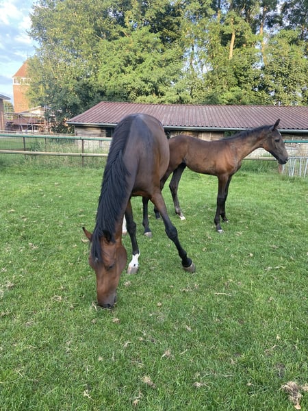 Hello, for sale is my eight-year-old mare "Count Me In". She is by Uriko x Cormint. The mare is very well-behaved and uncomplicated in handling. She is very sweet with everything you need to do in everyday life with the horse. I bought her when she was six years old (she had a foal with her previous owner) and backed her without any problems. She was trained up to A level in jumping, but due to my profession, I no longer had the time to further develop her, which is why she was bred to Charthago Blue OLD (Klatte Stud) in 2024. She gave birth to a healthy colt at our home without complications—I was present. On June 21, 2025, the little colt was awarded at Klatte Stud; the entire presentation can be found on Clip My Horse (Cayman Blue SW). The mare is only being sold because I would like to breed ponies, as that fits better with our facility. If you have any further questions, feel free to send a message!