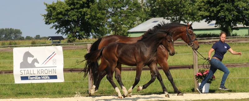 Portrait of Our Holsteiner Mare "Leilani SKH" Holsteiner // Line: 628 B // Born: 2018 // Height: 16.1 hh Cornet Obolensky – Calato – Concerto II "Leilani SKH" (Cornet Obolensky – Calato – Concerto II) was born in 2018 at Stall Krohn and is now used as a broodmare. She has produced three foals so far. Her dam, "Viola XI" (Calato – Concerto II – Joost), comes from the renowned Holsteiner Stamm 628B. Born in 2005 at Stall Krohn, she has also been used as a broodmare since then. To date, she has foaled nine offspring, including: - "Quintino" by Quidam de Revel, born 2011 – Approved in Zangersheide – Successful in show jumping competitions up to 145 cm - "Tacoma" by Taloubet Z, born 2013 – Successful in show jumping competitions up to 140 cm - "Cantuccini" by Catoki, born 2014 – Successful in show jumping competitions up to 145 cm - "Leilani SKH" by Cornet Obolensky, born 2018 – Currently active as a broodmare at our stable The granddam, "Lady Mobilcom" (Concerto II – Joost – Lago Maggiore), was born in 1996 in Hedwigenkoog at Otto-Boje Schoof’s farm. "Lady Mobilcom" was the winner of her mare performance test and confirmed her outstanding qualities as vice-champion at the Elite Mare Show in Elmshorn and also as vice-champion at the European Mare Show in Brussels in 1999. In 2005, she joined Stall Krohn. Special importance is attributed to her sire, "Concerto II" (Contender – Ahorn Z – Wahnfried), born in 1992 and bred by Otto Peters. Sadly, this exceptionally talented stallion passed away after only five years. Nevertheless, his remarkable qualities were successfully passed on to his progeny. Initially, his offspring were perceived as somewhat lacking in rideability due to their high energy and ambition in the jumping course. However, this drive ultimately benefited their performance. "Concerto II" was active in breeding for only three years before his death, but his breeding value is evident in the high caliber of his descendants. He is regarded as one of the most valuable sons of Contender. "Lady Mobilcom" produced ten foals, among which the following are noteworthy: - Stallion "Cabachon" by Casall, born 2004 – In 2009, finalist at the World Young Jumping Horse Championships in Lanaken/BEL, with Norwegian rider Stein Endresen – Achieved further successes in international competitions with Oleg Krasyuk, Ulrich Kirchhoff, and Katharina Offel – In 2013, third in the Grand Prix of Rastede, and in 2014, he continued his sporting career successfully with young rider Mathis Schwentker – As a breeding stallion, "Cabachon" set standards in Scandinavia, being the most-used jumping sire in Sweden in 2010. He has passed on his qualities impressively to his offspring, including "Camelot 143" (Cabachon – Baloubet du Rouet – Quilot Z), who won the Grand Prix of Riesenbeck in 2023. Furthermore, "Lady Mobilcom" has produced several district premium mares, such as: - Broodmare "Viola XI" by Calato, born 2005 - Broodmare "Wolke XVII" by Calato, born 2006 - Broodmare "Barcelona IV" by Quidam de Revel, born 2009 From the Holsteiner Stamm 628B, numerous international sport horses have emerged, including: - "Carino" (Ulrich Kirchhoff) - "Classic H" (Toni Haßmann) - "Alcazaro" (Jürgen Kurz) The Stamm has also produced several approved stallions, among them: - "Lavaletto" - "Romantiker" - "Broker I" The sire of "Leilani SKH" is the world-famous stallion "Cornet Obolensky" (Clinton – Heartbreaker – Randel Z).