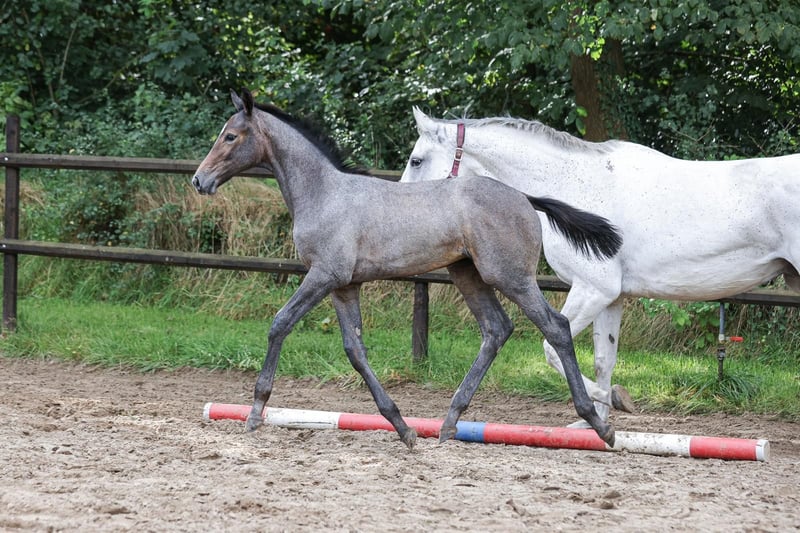 Mi yegua India Blue está preñada de Cartello VDL. Esperamos el potro a finales de mayo de 2026. Esta cría es una repetición, ya que hace dos años funcionó muy bien. Creo que no hace falta decir mucho sobre Cartello VDL, que es medio hermano de Cardento, debido a su propio rendimiento. Además, esta cría fue originalmente buscada para unir dos líneas de sangre de Lord. Con el padre materno Zirocco Blue, se han logrado más éxitos a nivel mundial en esta línea materna. Ella misma ha sido galardonada con el premio del sindicato. Así, India Blue es la quinta yegua en una línea de ascendencia ininterrumpida que ha recibido el premio estatal o del sindicato. También tengo en mi posesión una hija de Cascadello con 53 puntos. Su potro, de Pegase van de Rythershof, alcanzó este año en Hörup un precio de adjudicación de 17,500 euros. India Blue nos ha dado hasta ahora 8 potros. El potro de este año, de Clarimo, ya está vendido y será destetado en octubre. Los hermanos de sangre de India Blue, Zornell 1 y 2, se han destacado en saltos de gran dificultad. La madre de India Blue, la yegua Zypern, es la hermana completa galardonada del semental aprobado Cancoon, que también fue victorioso en saltos de obstáculos sobre 2,05 m. Por favor, llámame si estás interesado. Estaré encantado de contarte más. ¡Adquieres con India un caballo sano, resistente y honesto!
