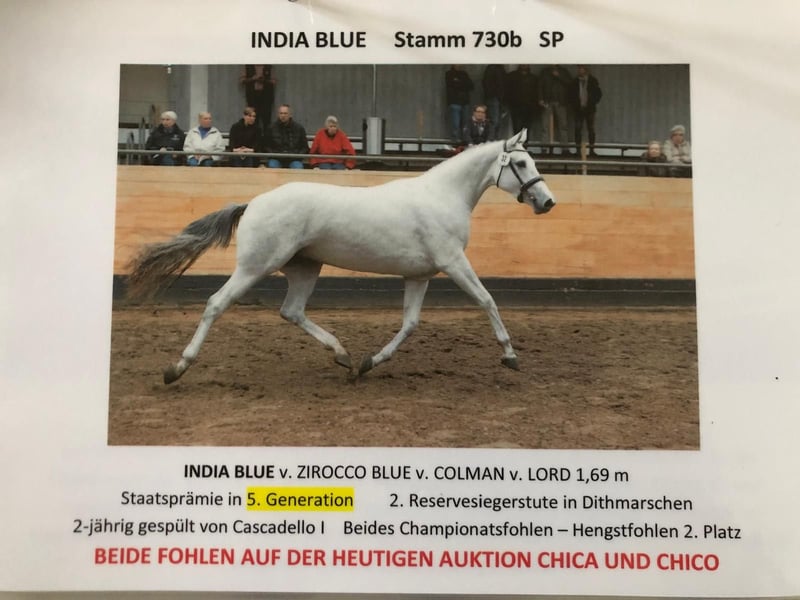 Meine Stute India Blue ist tragend von Cartello VDL. Das Fohlen erwarten wir Ende Mai 2026. Diese Anpaarung ist eine Wiederholung, weil sie vor zwei Jahren so gut gepasst hat. Siehe Bild Nr.2 Das Olympia-Pferd Cartello VDL ist der der Halbbruder zu Cardento. Durch diese Anpaarung hat sich drei mal das so sehr begehrte Lord-Blut vereinigt. Mit dem Muttervater Zirocco Blue kam nochmals Welterfolge in diesen Mutterstamm. India Blue ist mit der Verbandsprämie ausgezeichnet. Somit ist India Blue die fünfte Stute in ununterbochener Ahnenfolge die Staats- oder Verbandsprämie bekommen hat. Auf dem Bild Nr. 11 ist eine Tochter von Cascadello aus India Blue. Diese mit 53 Punkten ausgezeichnete Stute befindet befindet sich auch in meinem Besitz. Ihr Fohlen - von Pegase van de Rythershof - erzielte dieses Jahr in Hörup einen Zuschlagspreis von 17500 Euro. India Blue brachte uns bisher 8 Fohlen. Das Fohlen aus diesem Jahr, von Clarimo, ist verkauft und wird im Oktober abgesetzt. Die gekörten Vollbrüder zu India Blue - Zornell 1 und 2 - haben sich beide in schweren Springen bewährt. Die Mutter von India Blue, die Stute Zypern, ist die staatsprämierte Vollschwester zu dem gekörten Hengst Cancoon. Die Bilder 6 und 7 zeigen die Stute Zypern drei und siebzehnjährig. Ihr gekörter Vollbruder - Cancoon - war siegreich im Barrierespringen über 2,05 m. Sie erwerben mit India ein gesundes, hartes und ehrliches Pferd!
