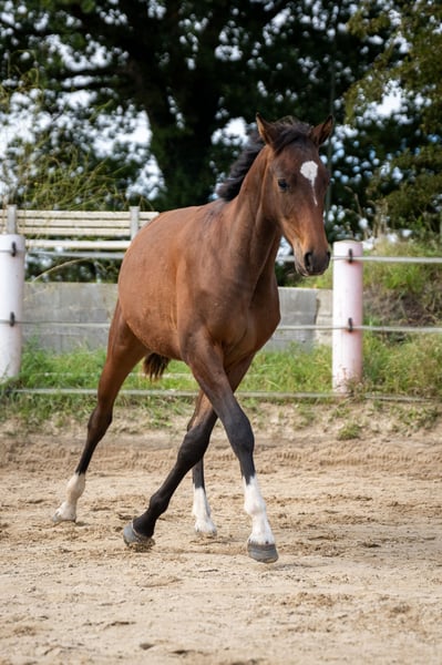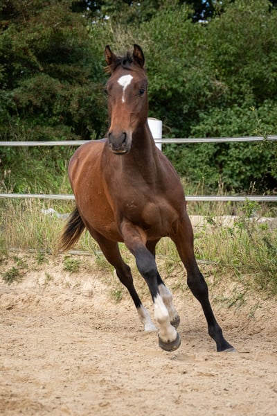 Qu Vadis est un jeune entier prometteur, très proche de l'humain, doté d’un caractère exceptionnel. Il séduit par sa gentillesse, sa calme et sa sérénité — des qualités idéales pour devenir ultérieurement un cheval de famille ou de loisir fiable. Son père est Quell Mexx, et il descend du côté maternel d’une jument Lucky Champ, Stamm 4815. Il possède de bonnes qualités de galop (GGA) et grandit actuellement dans un groupe composé de jeunes entiers et de hongres, bénéficiant ainsi d’une éducation naturelle et adaptée à ses besoins. Il connaît déjà la licol, le pansage et le maréchage, et se montre toujours sage et respectueux dans ses interactions.