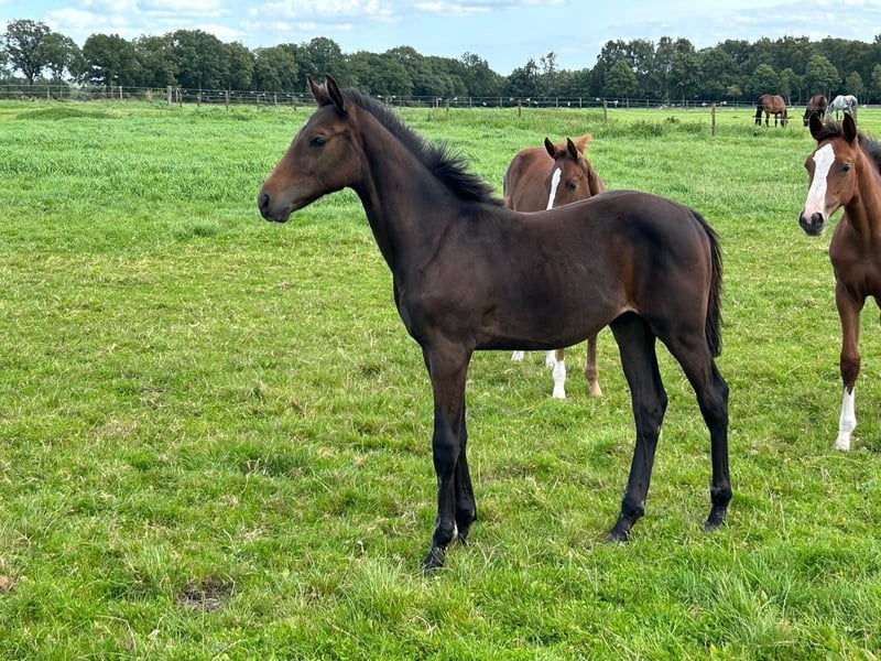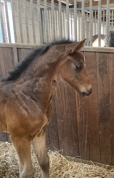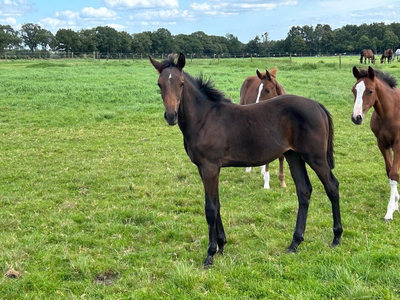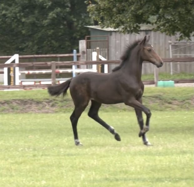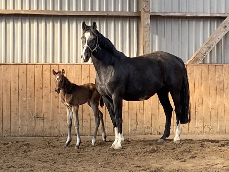 Award-winning colt from a hobby breeding for sale. Vranz presents himself in a stylish dark coat, very athletic, long-legged, and blood-typed. He impresses with good basic gaits, with his canter standing out due to a very active hind leg. Having grown up in a herd, Vranz is people-oriented and always up for a scratch. He has mastered the basics of foal training. His pedigree gives hope for a successful competition career. His father, Vigado, is only 7 years old and already successful in international young horse show jumping competitions. The dam's sire, Diarado, himself successful in S-level show jumping, has produced many successful offspring in all disciplines. Vranz's mother, Giarada, is ridden and was successfully presented in young horse competitions for one season. She showed herself to be willing and rideable, jumps carefully and with ability. From the direct maternal line (lineage 3782), several S-successful show jumpers have emerged, and there are also dressage successes up to class M. We wish for Vranz new owners who will raise and promote him in a species-appropriate manner. He can be handed over starting from September after weaning. We are happy to answer any further questions, and on-site visits are warmly welcomed! TEL.: +49 162 3478102