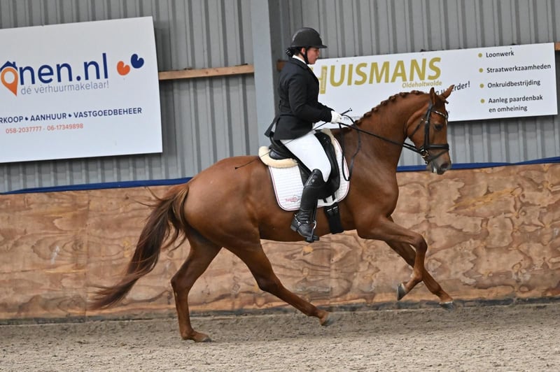Cette jument a été championne lors de la sélection de juments de Gelderland/Flevoland cette année, dans la catégorie des juments de 4 ans et plus. Il y a deux semaines, elle a passé une inspection IBOP avec une note de 82 points : 7,5 pour le pas, 8,5 pour le trot, 8,5 pour le galop, 8,0 pour la souplesse, 8,5 pour la posture et l’équilibre, 8,5 pour la capacité à monter, et 8,0 pour le potentiel en dressage. N’ayant pas encore été examinée par un vétérinaire agréé, elle est actuellement classée « Keur » mais n’a pas encore obtenu le statut d’« Elite ». Elle est actuellement engagée avec succès en dressage niveau L2 et prête pour le niveau M1. Sa mère est classée en Inter I et est en entraînement pour l’Inter II. En tant que 5 ans, elle a participé au Championnat du Monde des jeunes chevaux. Deux étalons agréés issus de la même mère, dont Dutch Dream, sont également présents. Des radiographies sont disponibles. Attention ! Tous nos prix s’entendent hors TVA de 21 %.
