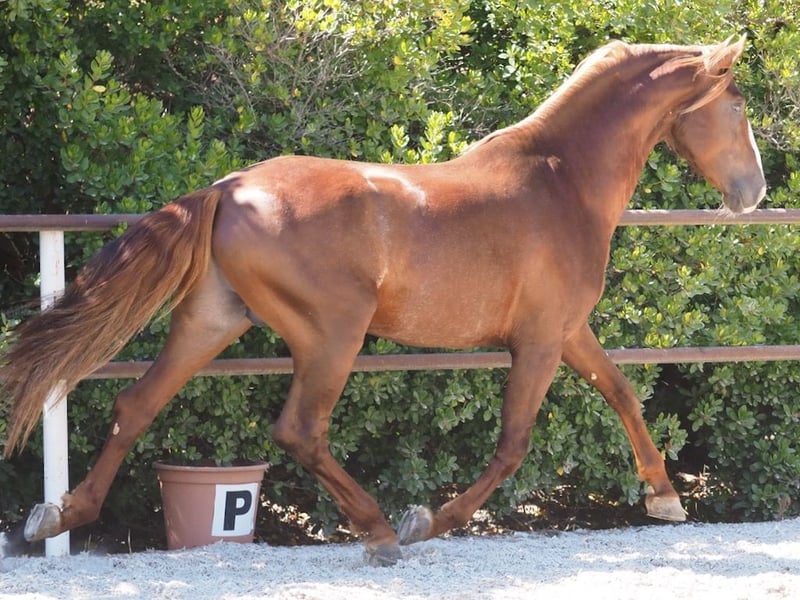 This exceptional Spanish chestnut horse is a very special horse because of its impressive color, a beautiful chestnut color with a light mane and tail. The elegance of his face and neck make him a very special horse, a very expressive horse with which you will not go unnoticed. With a medium size at the moment, he is a horse with a lot to develop, his morphology is very correct, with straight and wide movements, with no bells and a strong and well plumbed ground. His outstanding walk and exceptional canter make us think of him as a horse with a great future projection for dressage, also for his trot which is wide and with good mechanics. Ridden at basic level, he has a dressage level that is comparable to his age, but with a very good working base, this progress is due to his good character and predisposition for work. An exceptional horse with a good value for money, that will surely surprise his new owner.