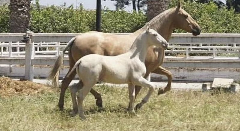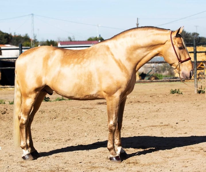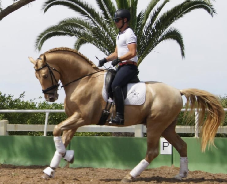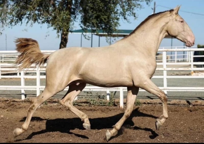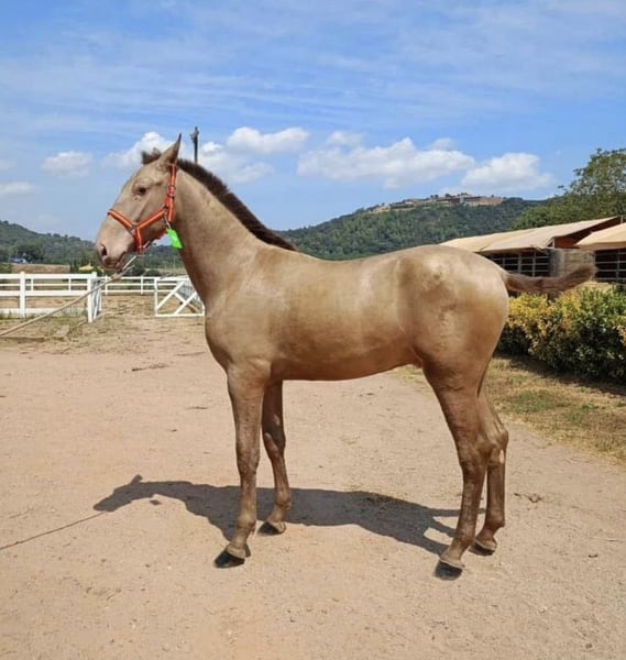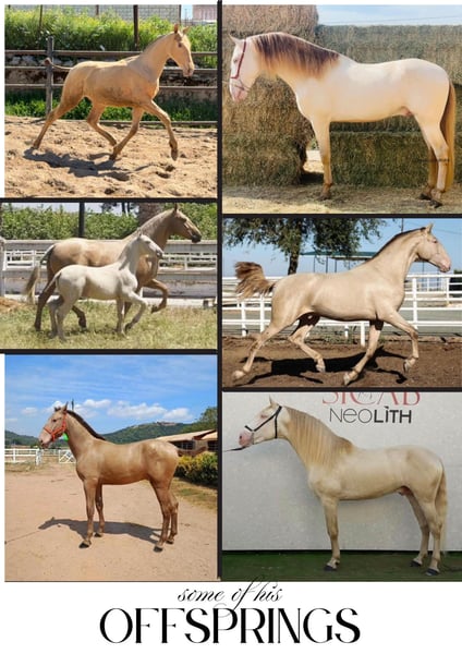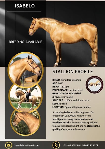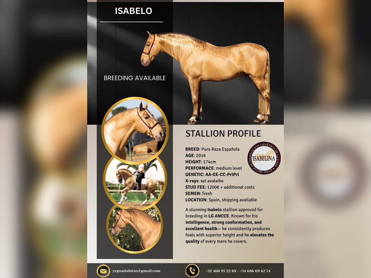 BREED: Pura Raza Española COLOR: ISABELO HEIGHT: 174 cm PERFORMANCE: Medium level GENETICS: AA-EE-CC-PrlPrl X-RAYS: Set available STUD FEE: 1200€ + additional costs SEMEN: Fresh — LIFE FOAL GUARANTEE LOCATION: Spain 🇪🇸 (shipping available worldwide) ✨ Exceptional PRE Stallion — Approved by ANCCE LG ✨ A truly outstanding Isabelo stallion, combining rare genetics, size, and proven breeding quality. Fully approved for breeding in the ANCCE LG studbook. 🧬 What he consistently produces: Foals with remarkable height and strong frame Excellent conformation and top-line Outstanding temperaments — rideable, intelligent, and willing A clear upgrade in type, movement, and overall quality 🌟 Color & Genetics Advantage: His PrlPrl (Pearl homozygous) genetics guarantee transmission of his unique golden coat, producing foals with striking, luminous colors highly demanded in today’s market. 💎 A stallion that not only improves your mare — but elevates the entire breeding program. ⚜️ Rare opportunity to access beauty, size, character, and color in one package