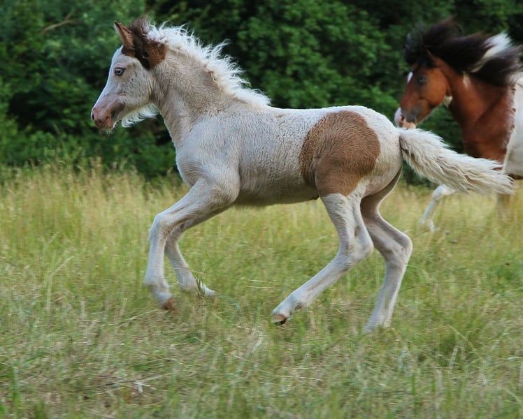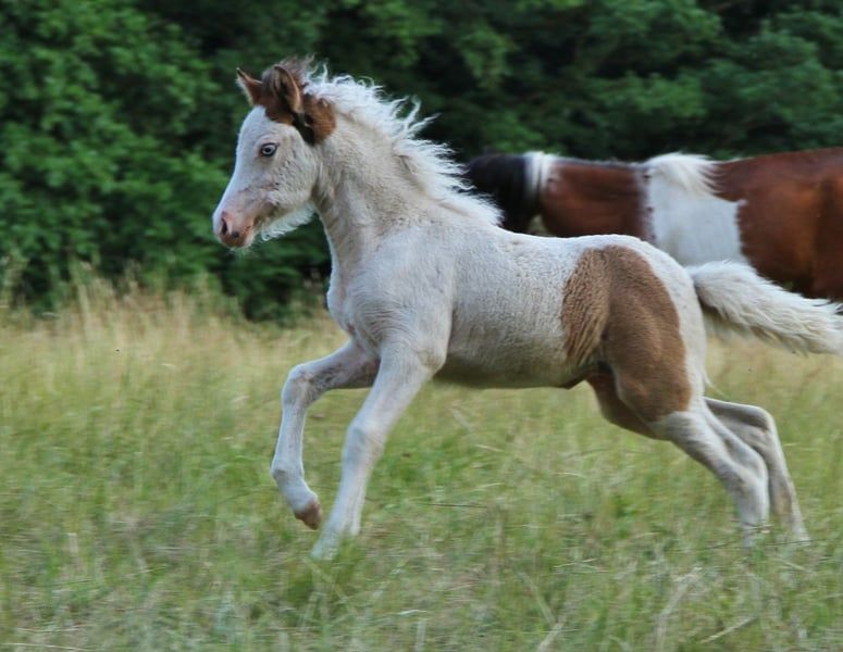 Ich biete hier für kurze Zeit die Gelegenheit eine Farbbombe mit guter Abstammung und schicken Gängen zu Absolutem günstigem Festpreis zu erwerben. Bifröst ist via Test bestätigt Braunfalbschecke mit Splash. Daher ihre aussergewöhnliche Zeichnung die sie überall hervor stechen lässt. Zusätzlich ist sie bei späterem Zuchteinsatz ein Farbgarant da sie reinerbig Schecke ist und daher alle ihre Nachkommen zu 100 % Schecken sein werden. Bifröst ist bei mir geboren, seitdem gesund und regelmäßig entwurmt, Ekzemfrei aus Ekzemfreien Eltern und Großeltern. Sie ist den Mensch gewöhnt und begegnet ihm Unartenfrei, respektvoll, neugierig und freundlich. Ihre Hufe wurden regelmäßig Freistehend geschnitten und auch das Verladen und im Hänger gefahren werden hat sie durch Weideumtrieb positiv kennengelernt. Ihre Vollen Papiere liegen vor, mit Heljar fra Brekknakoti als Opa und väterlich Bekan fra Kolsholti, Glampi fra Vatnsleysu und weitere bekannte gut geprüfte Hengste bringt sie eine ansprechende Abstammung mit. Bifröst zeigt sich Fünfgängig in den ersten Lebensmonaten war der Tölt ihre liebste Gangart bis sie den Trab gefunden hat. Auch Pass wurde Freilaufend schon gesichtet. Aktuell bevorzugt sie meistens ihre guten und sicher vorhandenen Grundgänge. Den Tölt zeigt sie gerne immer noch mindestens in den Übergängen manchmal aber auch Streckenweise. Alle ihre Gänge sind raumgreifend mit gutem Tempo und schöner Haltung. Ihre Mutter ist eine große kräftige Stute und auch ihr Vater bringt ein stabiles elegantes Gebäude mit. Bifröst ist gut entwickelt, aktuell ein großes propperes mädel daher gehe ich davon aus das sie mindestens 140 Endmaß erreichen sollte mit kräftigem etwas elegantem Gebäude. Ich sehe ihre Zukunft in gehobener Freizeit, Zucht und Sport. Wer die süße Maus kennenlernen möchte darf gerne mit Termin vorbei kommen. Sie kann jederzeit in ein neues Zuhause umziegen. Es gibt kein Video und auch nicht die Möglichkeit eins zu machen. Wer wirklich Interesse hat der kommt vorbei und lernt sie persönlich kennen. Wer so wie ich früher ist und auch mal ein Pferd nur anhand von Fotos kaufen möchte dem stehe ich nicht dagegen. Bei echtem Interesse freue ich mich auf Nachricht.