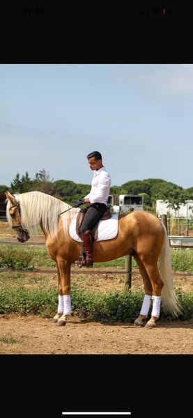 Zum Verkauf steht ein beeindruckendes Hispano-Arabisches Pferd mit goldener Palomino-Farbe. Derzeit ist es 4,5 Jahre alt, misst 1,65 m und besitzt eine elegante, tragfähige Erscheinung. Es ist noch jung und verfügt über ein vielversprechendes Entwicklungspotenzial. Charakter und Fähigkeiten: Es ist ein unkomplizierter, ausgeglichener und sehr angenehmer Begleiter im Alltag. Besonders menschenbezogen zeigt es stets Respekt und ist beim Training immer motiviert. • Niveau: Grundkenntnisse in den drei Grundgangarten. • Exterieur: Sehr zuverlässig, geht problemlos alleine ins Gelände. • Vielseitigkeit: Perfekt für Freizeit, Amateurdressur oder für einen Reiter, der einen gesunden, ausgeglichenen Partner sucht. Lebensweise und Gesundheit: • Haltung: Gewöhnt an die Weide mit Artgenossen (sozial), kennt auch den Offenstall. • Transport: Problemloses Reisen. • Gesundheit: Aktuelle Impfungen, gesundes Pferd. Besonderheiten: Sein vorbildliches Wesen, seine Vielseitigkeit und die außergewöhnliche Farbe.