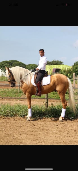 À vendre, superbe cheval Hispano-Arabe à la robe palomino dorée. Actuellement âgé de 4 ans et demi, il toise 1m65 et présente un beau modèle porteur avec une présence élégante. C'est un cheval encore jeune qui possède un beau potentiel d'évolution. Caractère et Aptitudes : C’est un compagnon facile, posé et très agréable au quotidien. Particulièrement proche de l'homme, il se montre respectueux et toujours volontaire au travail. • Niveau : Bases acquises aux trois allures. • Extérieur : Très fiable, il sort seul en extérieur sans difficulté. • Polyvalence : Idéal pour le loisir, le dressage amateur ou pour un cavalier cherchant un partenaire sain et équilibré. Mode de vie et Santé : • Vie : Habitué au pré avec des congénères (sociable), il connaît également le box. • Transport : Voyage sans difficulté. • Santé : Vaccins à jour, cheval sain. Points forts : Son mental exemplaire, sa polyvalence et sa robe originale.