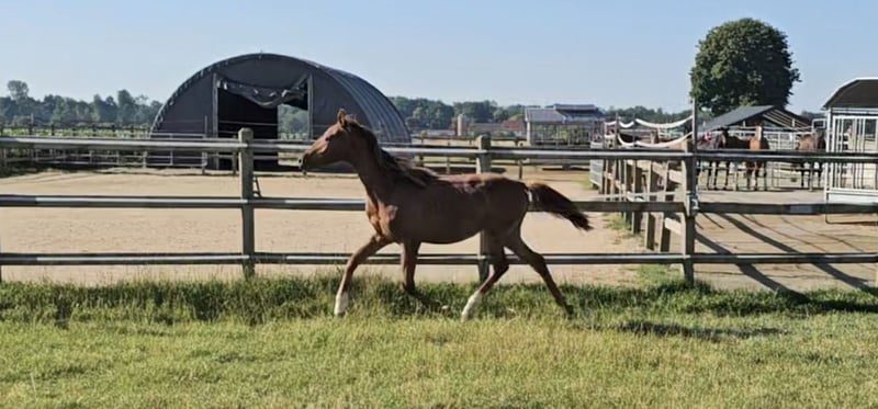 ¡Potranca de salto nacida en abril de 2024! Esta yegua de un año está especialmente bien lograda. Tiene una cabeza hermosa, una mirada atenta y despierta, excelentes movimientos y una mecánica muy bonita y elegante. Saltar es algo que saben hacer sus padres y abuelos. Un toque de sangre en el pedigree aporta el fuego en el corazón de esta hermosa dama. Su padre, Devil 2000 Z, encarna la esencia del atleta moderno y muestra sorprendentes similitudes con su fenomenal padre, Dominator 2000 Z. Desde el primer momento, nos fascinó con su imponente presencia, su impresionante capacidad y su estilo ágil y ligero. Su madre, China Touch Hero, también es la madre de Sea Coast Don't Touch Tiji Hero, el padre de nuestro superestrella Dourkhan Hero Z. Vemos a esta deportiva dama compitiendo más tarde en salto, así como en la doma clásica. Esperamos su contacto para un encuentro personal con Domina ZPF.