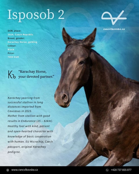 Find unique connection with Karachay Horse💞 We have discovered this rare, tough and empathetic horse breed from Caucasus 6 years ago and by today, we have 10 of them on our small ranch near Krkonoše mountains in Czech Republic. We have imported amazing stallion Ichsan in 2023 and now we are offering his first foals! Isposob - black, year-old gelding. Healthy, friendly, kind and cooperative. He has ancestors with good results in Endurance sport. Karachay horses are most talented for Endurance, but are also talented for western riding (working on ranch), carriage riding, jumping and are beautiful for dressage thanks to their elegant and soft movement. Our horses are all year on pasture, with minimum feeding requests. We honour the path of horsemanship and lead our horses to respectful friendship with human. We would love to find sensible people who can give our foal happy home and life. For more information visit - https://www.rancvlkovsko.cz/l/isposob-2/ (Last 3 photographs: Father Ichsan 11, Mother Dalekaja, Mother & Father together)
