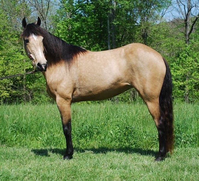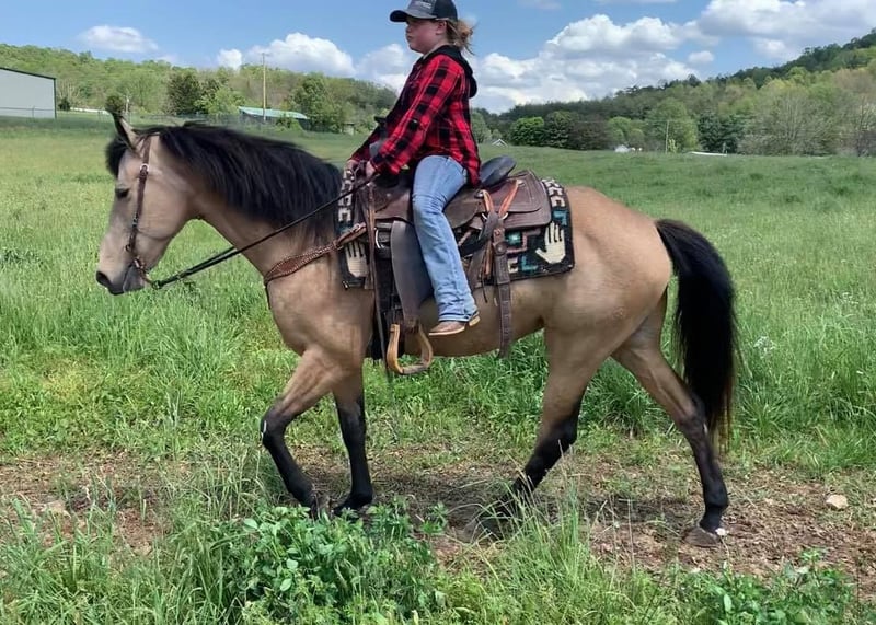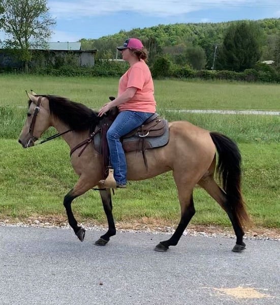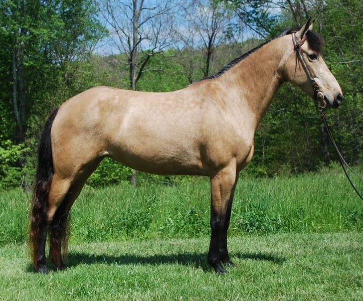 It’s fixing to be summer and people are going to be in full summer mode. But due to this nasty virus this is going to stop a lot of families from wanting to go out on big vacations around lots of people. So this year why not do a little social distancing in the woods with a nice mare who just happens to be a Summer! Dillon’s Summer Sundown “Summer” is a super stocky built 14.3hh, 5 year old Registered KMSH mare with a lot of the biggest foundation names in the mountain horse industry in her pedigree. She is a gorgeous golden Buckskin with dark black legs, golf ball size dapples and a very thick mane and tail. We bought Summer back in the winter off an older man in Eastern Ky who had raised her. She had been trail rode her whole life by all different levels of riders. Since we have had her everyone in our family has rode her. She is the go to horse for the kids when they want to ride. She is safe for any level of rider. She will walk all day on a loose rein but will gait out when asked and stay in gait. She isn’t a horse you have to hold back or a horse you have to constantly kick to go. Summer is very friendly, likes people and likes attention. She has that meet you at the gate personality. You don’t have to catch her she will catch you! Summer handles quietly. She is easy to clip, wash, groom and great for the farrier. She stands quietly to be saddled and bridled. Always stands perfect to be mounted from the ground or a mounting block. Summer has a very comfortable running walk gait that she does. It is very smooth and can cover a lot of ground without a lot of effort. She also has a very nice canter that she will fall right into and then fall back to a walk. Summer will one hand neck rein, has a good woa and backs up with ease. Summer is a PHENOMENAL trail horse!! This little mare will take care of you. She is one of the most sure footed horses I have ever seen and it’s mostly because she really watches where she goes and eases up and over everything. She crosses all types of water, fallen trees and slippery rocks all with ease. She is great in traffic and around atvs. Wildlife and livestock safe. Not a spooky horse by no means. She likes her job and likes to please. If you are looking for that 1 in a million mare for the whole family here she is.
