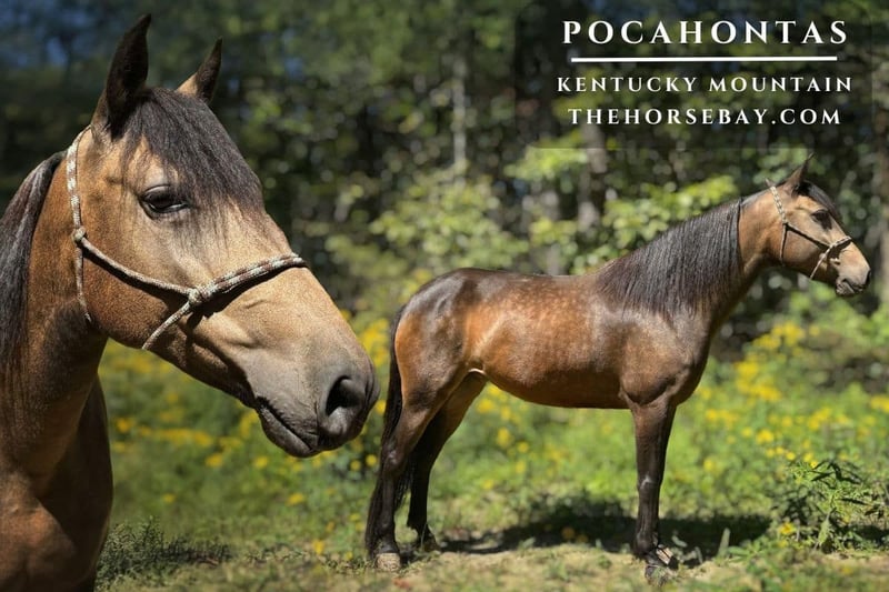 Pocahontas Beginner safe Loving- in your pocket Traffic safe/ATV/bike/Semi Stands for farrier Packs saddle bags/speakers/wildlife Rides Double Stands to mount/dismount Neck reins Easy to catch Gun fire safe Bullwhip safe Surefooted UTD on all vetting & dental work There are horses that come and go, and then there are horses like Pocahontas —the kind you never forget. This stunning sooty buckskin KY Mountain mare is just that just-right size standing 14.3H & thick! & will carry any rider with confidence! Pocahontas is built with the kind of beauty and balance that turns heads wherever she goes. But what makes her truly special isn’t just how she looks, it’s how she is. Pocahontas has the rare gift of patience and kindness, adjusting effortlessly to the level of her rider, whether it’s someone timid and learning or someone experienced and ready to go. Pocahontas has gone countless miles through every kind of terrain—from soft, easy trails to rugged mountain climbs—and she handles it all with the quiet confidence of a seasoned partner. My two small children who are 4 years old & 7 years old have been riding this wonderful mare by themselves & she has assisted in teaching them to ride alone. She will cross logs and water without a second thought, and she takes care of her rider every step of the way. She is sure-footed, traffic safe, and calm around dogs, bicycles, farm equipment, small animals, 4 wheelers and even wildlife. She is the definition of a true mountain horse! She has even carried flags, drug tarps without blinking. Or if you are an avid hunter, take your rifle or pistol & take your game home with you! Whether you’re riding out alone or with a group, she is steady, reliable, and never barn or buddy sour. Pocahontas is broke with a good one-hand neck rein, stops and backs with ease, and moves willingly off leg pressure. Best of all, she doesn’t need consistent riding to stay the same. Pull her out when you’re ready—she will be waiting with the same gentle heart and willing attitude every time. On the ground, she’s a pleasure, she stands to tack and mount and genuinely enjoys attention. She loads, unloads, and hauls with ease, and she’s happy in the stall or turned out with others. Pocahontas is a true treasure—steady, soulful, and ready to be someone’s forever partner on the trail and in the heart. Jeffersonville KY
