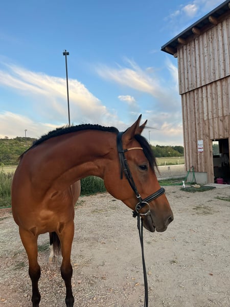 Caballo Kisberi de 5 años, curioso y amable, busca a su persona. Formás Figura significa "hermosa figura". Y así es, con su cuerpo esbelto, de patas largas y elásticas. "Fiffy" siempre es el primero en la valla, saluda a cada persona con curiosidad amistosa y nunca es brusco. En los dos años que ha estado con nuestra familia, ha conquistado muchos corazones de niños y padres con su encanto y ha aprendido diversas tareas. Ha sido educado de manera suave y paciente, prestando gran atención al ritmo, la relajación y patrones de movimiento biomecánicamente saludables. También ha explorado todas las áreas de mi enseñanza, conociendo diferentes tipos de trabajo en el suelo, trabajo libre, entrenamiento en la cuerda, saltos libres, trabajo con barras, senderismo y mucho más. Ha sido montado con y sin bocado y silla, incluso con riendas de cuello o solo con dos fustas. Se comporta bien como caballo de mano y en paseos por el campo, aunque necesita un guía seguro y tranquilo y más rutina en este aspecto. Su comprensión de las ayudas es buena y sutil, y realiza todos los aires en la pista de equitación. Buscamos para él un/a jinete con experiencia en caballos jóvenes, que se dedique a su formación como caballo de monta con paciencia, empatía y competencia profesional. Además, deseamos para él compañeros con los que pueda disfrutar de su gran alegría de jugar y mucha libertad de movimiento. Esto no podemos ofrecerle. Dado que mi hija está a punto de graduarse y tiene muy poco tiempo para él, y él es demasiado grande y enérgico para mis alumnos, estamos buscando un nuevo mejor amigo humano para él. Solo lo entregaremos si realmente todo encaja.