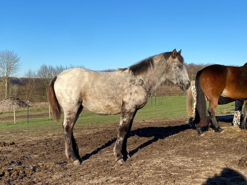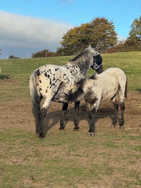 Lykke vom Duten is a very gentle and reserved Knabstrupper mare, currently ranking low in the herd hierarchy. We are only selling her because we are reducing our stock. She is an excellent broodmare from an old bloodline and has already foaled her second foal in 2025, a filly by Noël Christal af Kronplet. She is also in foal again to him for next year. The filly can be purchased with her. She is a very sweet little mare who initially had a dorsal stripe along her back. Her name is Lille Oryx von Mohrkirchen. Lykke's sire: Paco Lykke's dam: Lille Ged