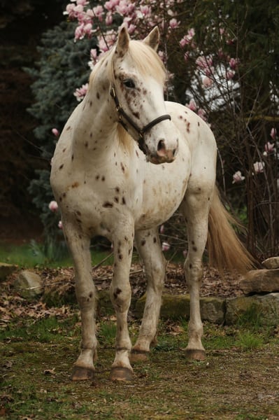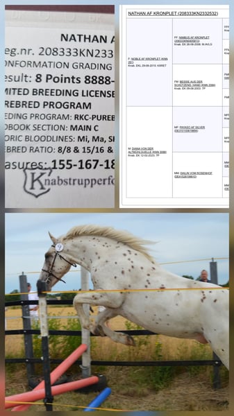 Nathan af Kronplet for sale! Original Knabstrupper Hengst ohne Fremdblut Wird im Mai 3 Jahre alt. Momentan 157cm gemessen. Nathan ist sehr menschenbezogen, intelligent und mitmachend, Selbstbewusst, cool, aber auch sensibel und fein im handling. Er wurde bei der Körung mit 8 bewertet, was für seine Qualität spricht. Ein Traum für jeden Reiter, der einen echten Partner fürs Leben sucht und ein besonderes Juwel. Sowohl für die Zucht, da er in der KNN eingetragen ist und 10 Decksprünge hat als auch fürs Reiten. Ich sehe ihn eher im barocken Bereich, akademischen oder Working Equitation. Ein Traumpferd zum Traumpreis, da ich 2 Hengste habe und einer mir genügt.