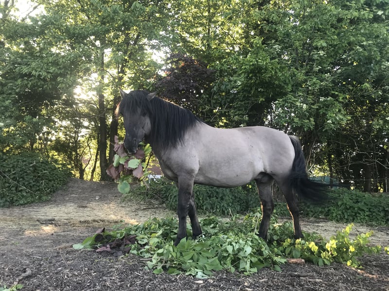 Gesunder, starker Konik Wallach im besten Alter. Hauptsächlich im Gelände geritten, auf Knotenhalfter und mit Vielseitigkeits Sattel, kennt auch Wassertrense und Ohne-Sattel-Reiten. Für junge Reiter / Kinder geeignet. Sehr gut erzogen, er geht im Gelände überall hin (Brücken, Wasser, Straßenverkehr), hat sehr bequeme und ausdauernde Grundgangarten. Auch als Wanderreitpferd bestens geeignet. Abgabe inkl. passendem Barefoot Cheyenne Sattel.