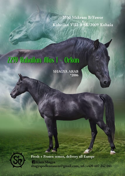Na sezon lęgowy 2022/2023 oferujemy ogiera hodowlanego Shagya Arab 2239 Kuhailan Afas I-CZ / Orkán, urodzony w 2006 roku, zrównoważony czarny ogier, niezawodny, inteligentny, wielki charakter i charakter.Ogier jest bardzo otwarty, spokojny, słodki. Jest zdrowy i ma negatywne testy SCID. Zabarwienie genotypem przeniesiono na badane potomstwo. Odnosił sukcesy w sporcie (wytrzymałość klasy S) i na wystawach. Rozmiar 164/154/185/20. Jego ogier 3550 Makram B / Fawor / (Bábolna, HU), nagrodzony w 2008 roku WAHO (Światowa Federacja za lub 1/1) - najlepszy koń arabski na Słowacji. Jego potomstwo odnosi duże sukcesy na pokazach, w wojsku z wynikami CEI **, a zwłaszcza w sportach wytrzymałościowych.Matka Koheilan VIII-8 SK / 2009 Kohaša po 3402 Koheilan VIII / Koh.IV-17 /. Zamrożone nasienie dostępne - dostawa na terenie całej Europy.