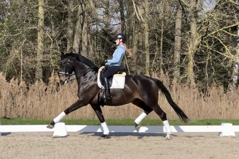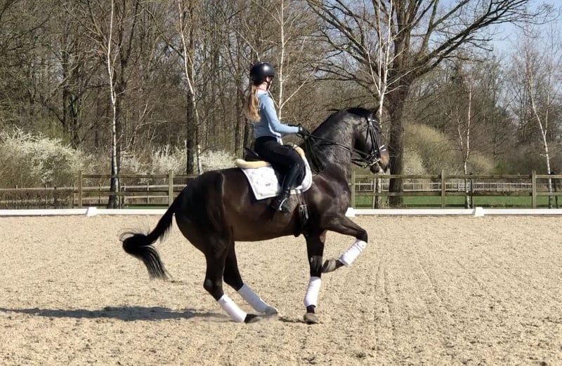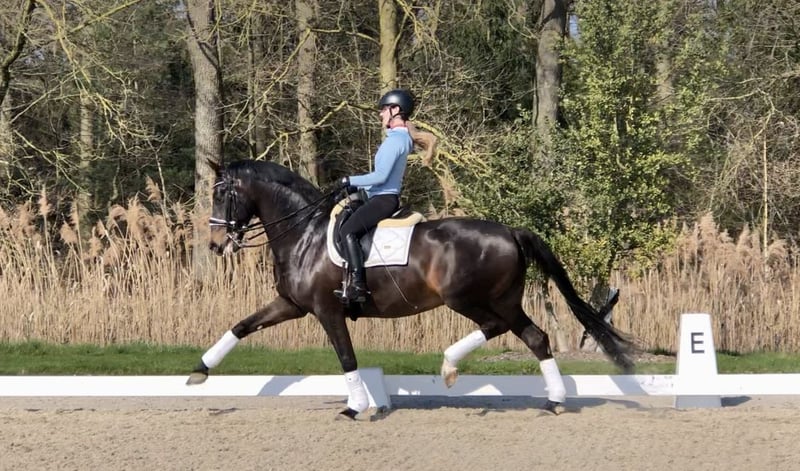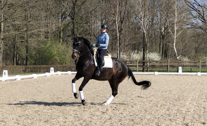 This 11-year-old gelding has extensive competition experience up to zzz. Well-behaved with no vices. X-rays available. Simple piaffe and passage, starting with one. Can be ridden in a snaffle or double bridle. Gentle and easy to handle, suitable for loading, farrier, veterinarian, etc. He is familiar with the lunge line. Location: Belgium.