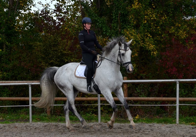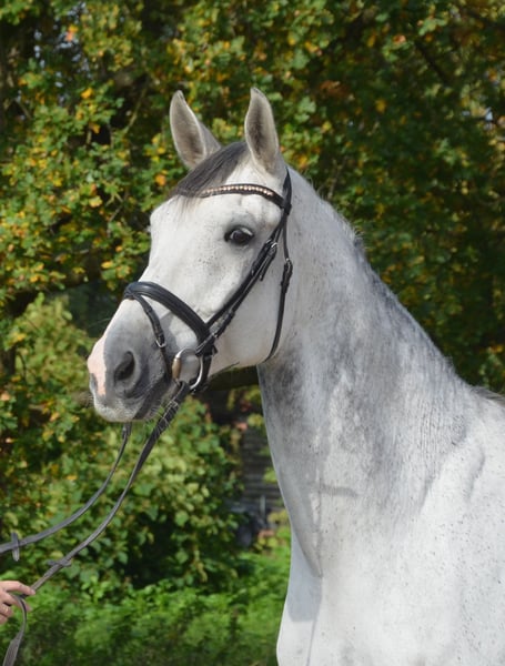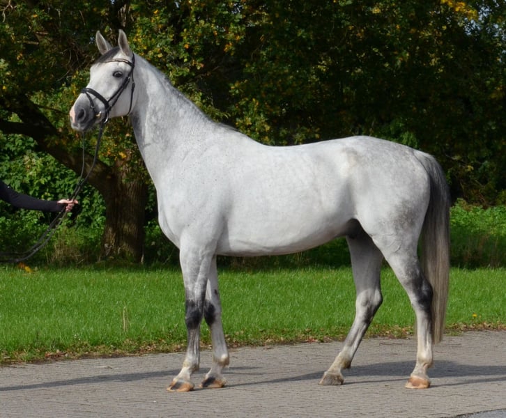 Z ciężkim sercem oferuję na sprzedaż mojego ok. 175 cm wysokiego, 11-letniego ogiera KWPN „Dusty” (Du Charmeur) od Dallas VDL x Burggraaf. Ten utalentowany ogier, o doskonałym rodowodzie, jest wszechstronny w użytkowaniu. Jego ruchy są elastyczne, dobrze wyczuwalne i mocne, co czyni go obiecującym partnerem zarówno na zawody, jak i dla ambitnych jeźdźców rekreacyjnych. W dyscyplinie ujeżdżenia wykazuje ogromny potencjał i jest pełen pasji. Na parkurze i w terenie okazuje dużo radości i chęci do nauki. Podczas woltyżerki jest uważny i spokojny – jest obecnie na początku swojej edukacji w tej dziedzinie. Zna jazdę w terenie zarówno solo, jak i w grupie. Jest bezproblemowy w pracy na lonży i podczas pracy na ziemi. Na zawodach i podczas treningów poza miejscem zamieszkania zachowuje pewność siebie i spokój zarówno w ujeżdżeniu, jak i na parkurze. Jest skoncentrowany i nie da się od niego odwrócić uwagi. Dusty jest kucem bezkopytnym, dzięki czemu nie wymaga używania obuwia. Dobrze radzi sobie z załadunkiem do przyczepy. Posiadam zdjęcia rentgenowskie z grudnia 2022 roku, obejmujące kręgosłup, kręgosłup szyjny, kolano, stawy skokowe i kopyta z ścięgnami (18 zdjęć). Na jednym z nich, w okolicy przedniego prawego kopyta, widoczny jest chip, który nie powoduje żadnych problemów. Był regularnie szczepiony, odrobaczany i konsultowany przez dentystę. Obecnie przebywa w dużej, otwartej boksie, zna także klasyczną stajnię na słomie. Dusty jest bardzo dobrze tolerowany przez inne konie w stadzie i ma raczej niską hierarchię. Sprzedaję go z powodów rodzinnych i braku czasu, który się z tym wiąże. Filmy z chodu i pod siodłem (w ujeżdżeniu i skokach) można przesłać na życzenie, przy poważnym zainteresowaniu.