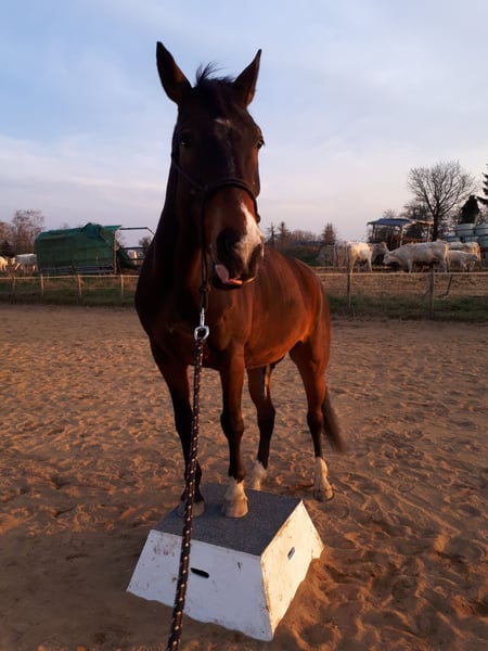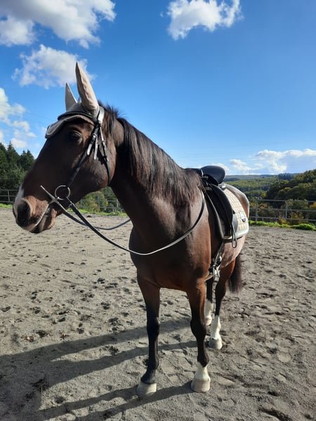 Ich suche nach einem neuen passenden Zuhause für meinen Wallach Sir Henry, da ich ihm aufgrund veränderter Lebensumstände leider nicht mehr gerecht werde. Ich habe Sir Henry nach den Grundzügen der klassischen Dressur selber ausgebildet. Er ist sehr fein zu reiten und möchte auf dem Reitplatz gefallen. Er kennt jegliche Seitengänge im Schritt und Trab auf feine Hilfen. Er ist sehr fleißig, lernbereit und stets lauffreudig. Ebenso im Gelände hat er ordentlich Go und ist dabei aber jederzeit händelbar. Er geht alleine als auch in der Gruppe ins Gelände. Aufgrund seiner Abstammung ist er auch fürs Springen geeignet und zeigt dabei große Motivation. Springen habe ich aufgrund fehlenden Equipments nicht weiter verfolgt, bis auf Cavaletti Hüpfer. Sir Henry ist temperamentvoll und daher nicht für Anfänger geeignet. Neben Reiten kennt er auch Bodenarbeit/Longieren am Kappzaum, Handarbeit an Trense oder Kappzaum, Freiarbeit, Spaziergänge sowie Zirzensik. Er ist ein aufgeschlossenes und sensibles Pferd und ist gut erzogen. Bei neuen/fremden Personen testet er das gerne mal aus. Wer ihm eine klare Führung gibt, hat ihn für sich gewonnen. Sir Henry ist Barhufer und stand bis vor kurzem in einem Offenstall mit 12 Pferden. Dort war er Herdenchef und machte den Job gut. Seit kurzem steht er in einer kleinen Gruppe in einem anderen Offenstall. Er ist sozialverträglich, spielt und schmust gerne mit seinen Artgenossen. Sir Henry ist schmiede- und verladefromm, regelmäßig geimpft und entwurmt. Die Zähne wurden das letzte Mal im Juli professionell gemacht. Ich verkaufe mein Pferd weit unter Wert, da er letztes Jahr über einen langen Zeitraum mit Magengeschwüren am Magenausgang zu tun hatte. Aufgrund der vergangenen langwierigen Erkrankung steht er aktuell körperlich nicht so gut da, hat abgenommen und ist wenig bemuskelt (die 2 letzten Bilder). Dennoch ist er gut drauf, fit und munter. Da ich wenig Zeit habe und ihm die Zeit zur Regenation geben wollte, habe ich ihn seit Juni nicht mehr geritten. Er wurde vor kurzem erstmals wieder geritten und war höchst motiviert und zufrieden, dass er wieder arbeiten darf. Sobald er wieder aufgebaut und vollumfänglich einsatzbereit ist, ist er ein toller Freizeitpartner und Reitpferd. Für seine nachhaltige Genesung ist ein passendes und liebevolles Zuhause ausschlaggebend, wo er zur Ruhe kommen kann (die Ruhe fehlte ihm bis zum Stallwechsel im Herbst) und keinem Stress ausgesetzt ist. Zudem ist er leichter Sommerekzemer. Je nach Sommer reicht ein Öl in Schweifrübe und Mähnenkamm alle 2-3 Tage oder bei stärkerem Juckreiz hilft ihm eine Ekzemerdecke, womit er super klar kommt. Seine Fütterung habe ich auf Sommerekzemer sowie magenempfindliche Pferde entsprechend angepasst. Ich wünsche mir ein liebevolles Zuhause im Offenstall in einer überschaubaren kleinen Herde mit ausreichend Fress- und Liegeplätzen. Keine Boxenhaltung. Ich gebe Sir Henry mit vollem Equipment ab (u.a. Kieffer Lousitano Dressursattel, Trense, Hufschuhe, Decken, Futter, Medikamente, etc.). Sir Henry hat volle Papiere (Equidenpass + Urkunde). Probereiten nur, wenn alles passt. Kein Händler oder Schulbetrieb. Keine Turniere. Platz vor Preis! Mir ist wichtig, dass Sir Henry in beste Hände kommt. Bei Interesse freue ich mich über eine kurze Vorstellung Ihrer Person sowie Beschreibung der Haltungsform.