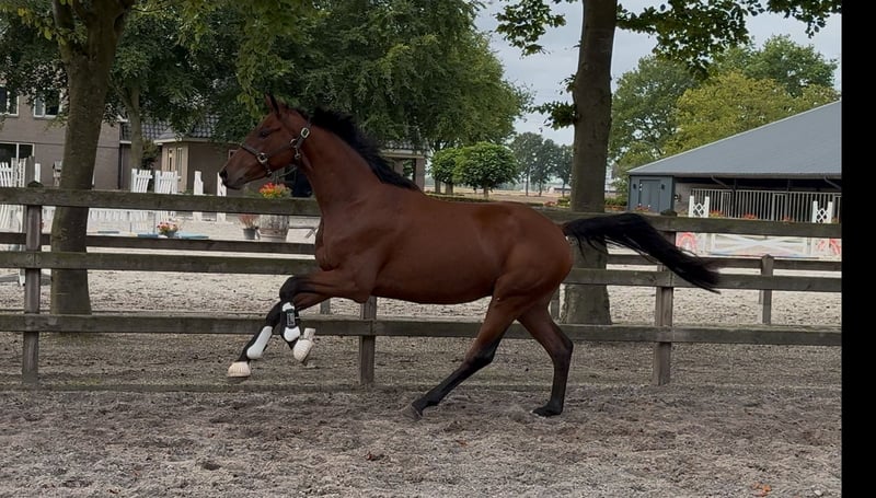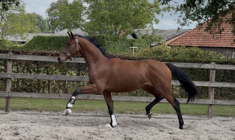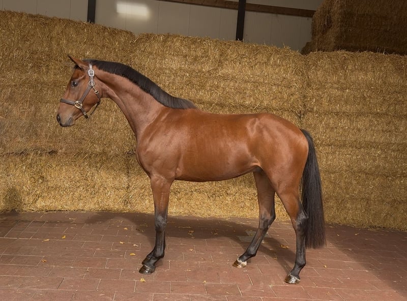 Getalenteerde jonge dressuurpaard van de bewezen hengst Bordeaux, komt uit een geweldige moederlijn met veel sportpaarden op hoog niveau. Prachtig model met veel jeugd, mooie expressie, lange benen en een opwaartse houding. Fantastische beweging, veel kracht en techniek gecombineerd. 3 Uitstekende gangen. Recent uit het veld, makkelijk in de hand. Nog niet begonnen met werken, gaat dagelijks in de paddock, in de stapmolen, makkelijk op de wasplaats. Recent klinisch en röntgenologisch gekeurd.