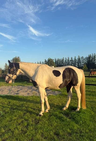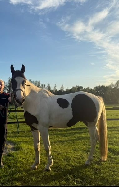 Mooi platenbonte veulen. Ruin met goed karakter. Kan je naar je hand zetten en zelf zadelmak maken. Is Gechipt, ontwormd en bekapt. Moeder is aanwezig. Geregistreerd bij KWPN.