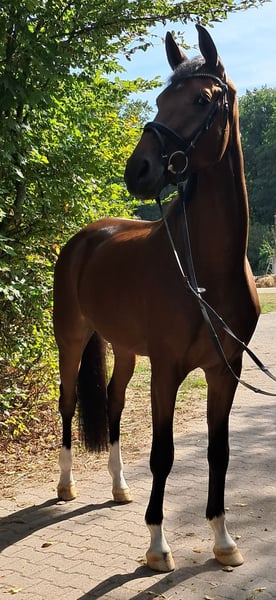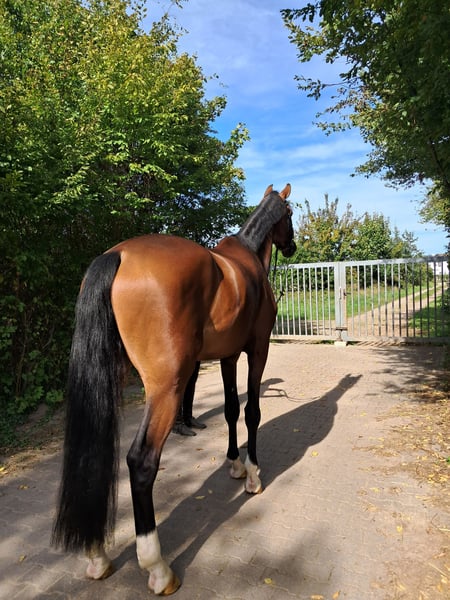 Here, a stunning large brown gelding is looking for his heart ❤️ person. Ricardo impresses not only with his appearance but also with his excellent basic gaits and wonderful character. A truly special horse is waiting here for his supporter. With an outstanding pedigree, character, and movements that leave nothing to be desired, he is a horse for the future, whether for a competition rider or an ambitious amateur. Of course, experience with young horses should be present to further support his training and unlock his potential. If you are interested in getting to know this dream horse, feel free to schedule an appointment for a trial ride. Trial ride €30. Phone 0178 6526058.
