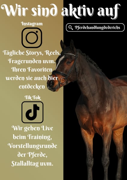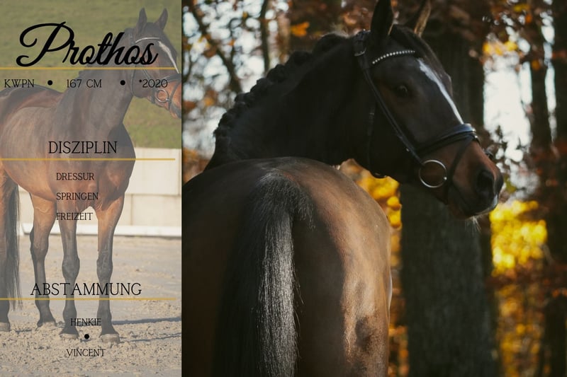 Prothos ist ein 2020 geborener KWPN Wallach ca. 167cm v. Henkie, Alexandro P x Vincent, Zaire *Prothos* ist ein wunderschöner Wallach mit sehr guten Bewegungen. Er ist rittig mit viel Qualität ausgestattet. Prothos hat bereits Turniererfahrung gesammelt und eignet sich auch für Jugendliche und nicht ganz so starke Reiter. Er hat auch schonmal einen Sprung gemacht, zeigt dort Freude und wird sicher bei Förderung auch dort viel Spaß bereiten. Im Gelände war er bereits bei uns und hat sich unkompliziert gezeigt. Im Umgang verschmust und Menschenbezogen. Er ist ein ganz tolles Pferd, ob für Freizeit oder höheren Sport, er bringt alles mit was man dafür braucht. Ein Hingucker an dem man nicht vorbei schaut. Er bringt eine aktuelle große AKU bereits mit. Pferdehandlung Dederichs – Ihr Partner für den Pferdekauf Kontakt & Erreichbarkeit: Anfragen bitte ausschließlich telefonisch unter 0173/9792139 Montag – Freitag: 09:00 – 18:00 Uhr Samstag: 09:00 – 15:00 Uhr Sonntag: Ruhetag Folgen Sie uns auf Social Media! Erleben Sie unseren Alltag mit den Verkaufspferden auf Instagram, TikTok & Facebook unter Pferdehandlung Dederichs Rabatt: Bei sofortiger Mitnahme Ihres neuen Traumpferdes erhalten Sie zwischen 5 %– 10 % Rabatt Probereiten & Vorführen: • Probereiten: 30 € pro Pferd (max. 2 Reiter), Betrag wird beim Kauf angerechnet • Feiertage: Proberitt 50 € • Vorführung durch unsere Bereiter: 25 € pro Pferd (Vorreiten, Bodenarbeit etc.) Ankaufsuntersuchung & Transport: • Viele unserer Pferde besitzen bereits eine AKU • Sie können selbstverständlich Ihren eigenen Tierarzt mitbringen • Gerne organisieren wir eine Untersuchung • Wir unterstützen Sie auch gerne beim Transport ins neue Zuhause Weitere Verkaufspferde: In unserem Stall stehen weitere Verkaufspferde, die noch nicht online sind. Falls Ihr Traumpferd noch nicht dabei ist, zögern Sie nicht, uns zu kontaktieren. Wichtige Hinweise: • Stockmaß-Angaben sind geschätzt und nicht exakt nachgemessen • Alle Beschreibungen sind subjektive Einschätzungen des Verkäufers und keine zugesicherten Eigenschaften Weitere Informationen finden Sie unter: www.Pferdehandlung-Dederichs.de