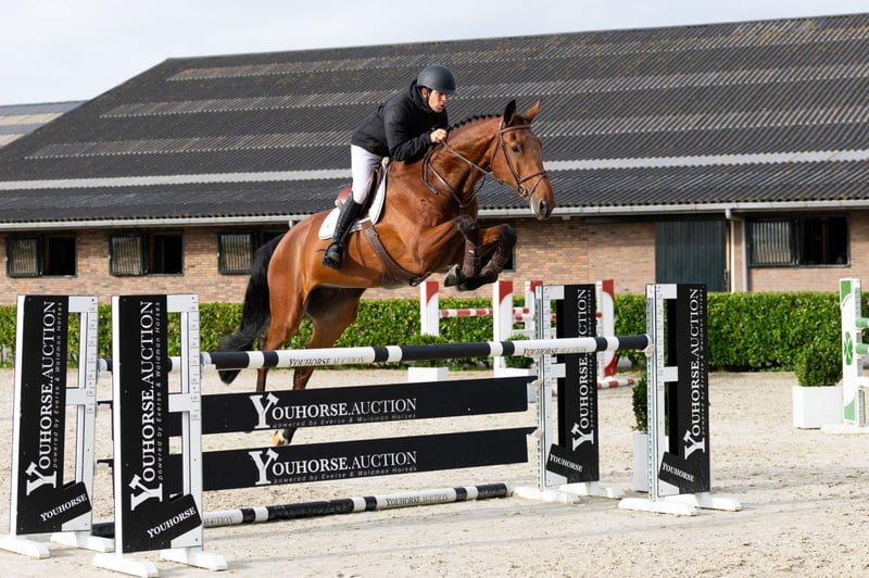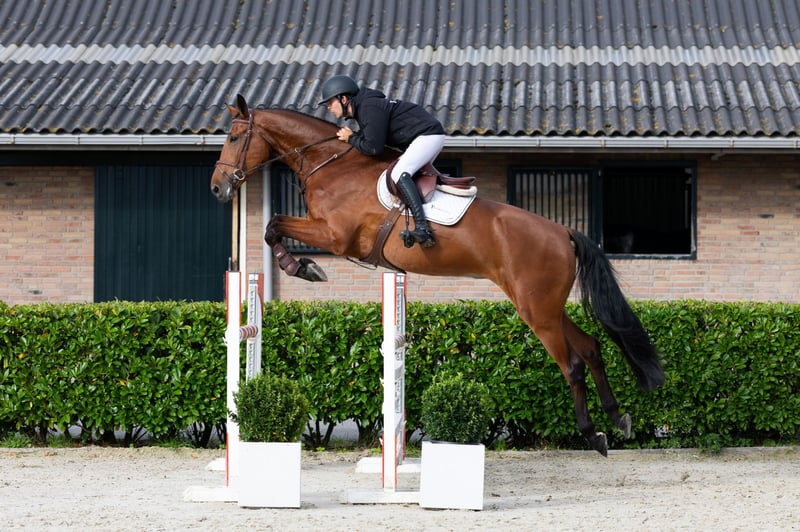 The five-year-old Papillon van Lange Weeren is a very nice amateur horse that is well-behaved, has good bloodlines, is cautious, and easy to ride. He has experience in 1.10 m show jumping courses. His sire, Jenssen VDL, is bred from the same line as the successful Nations Cup stallion Modesto. Jenssen VDL was the performance champion of the KWPN performance test with a score of 86.5 points, including a 9 for canter and reflexes. His dam, Kwien van Lange Weeren, descends from Douglas. The granddam, Willkenney (Corland x Concorde), jumped courses up to 1.35 m and comes from a 1.30 m show jumping mare. Willkenney is also the dam of the two 1.45 m jumping horses Domino van Lange Weeren and the nine-year-old Lodewijk van Lange Weeren.