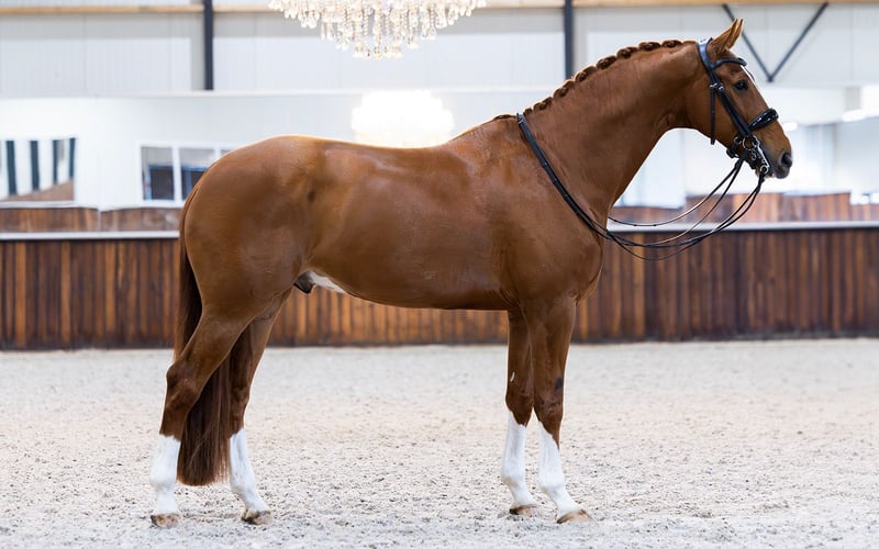 Dieser kompakte, korrekt gebaute Rappe mit vier weißen Beinen ist nicht nur ein Augenschmaus, sondern auch ein äußerst angenehmer Partner im Umgang. Magic ist derzeit auf PSG-Niveau eingestuft und zeigt dort viel Talent und Einsatzbereitschaft. Er arbeitet gerne für seinen Reiter, lernt schnell und denkt gut mit, was ihn zu einem angenehmen und zuverlässigen Partner sowohl im Training als auch im Viereck macht. Sein Vater ist Hero, ein Sohn des weltberühmten Johnson, der jahrelang die WBFSH-Rangliste anführte. Auf der Mutterseite finden wir die einflussreichen Hengste Metall und Kristall – beide bekannt für ihre starke Vererbung von sportlichem Talent und Rittigkeit. Magic ist ein vollwertiges Pferd mit Ausstrahlung, Arbeitswillen und einem Top-Charakter – bereit, gemeinsam mit seinem neuen Reiter in der Sportkarriere weiter zu wachsen.