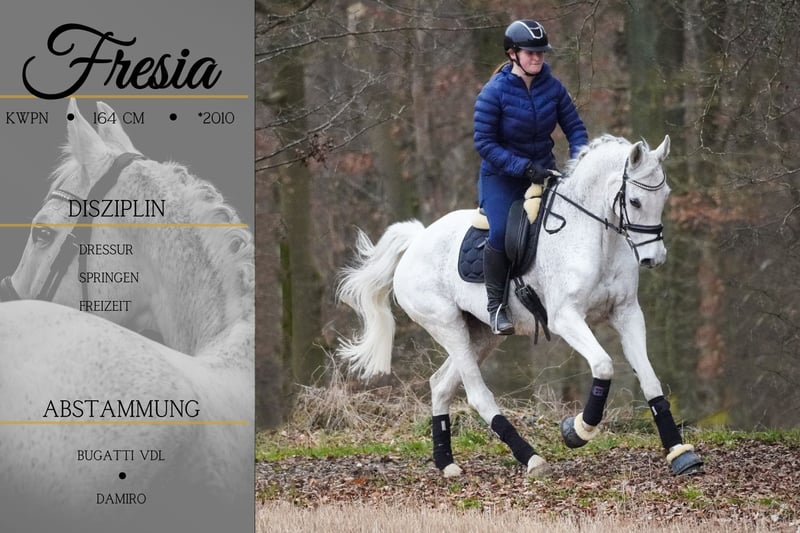 On behalf of the seller: Fresia is a mare born in 2010, sired by Bugatti VDL, with Siöverstone x Indoctro bloodlines, approximately 1.64 m (16.1 hh). *Fresia* is a very sweet mare that competes in dressage and jumping. She is ideally suited as a school horse for less experienced riders and children. She could also be used immediately in a riding school setting. When ridden in the terrain, she is also uncomplicated and well-behaved. She is accustomed to being ridden with draw reins and is also calm on the lunge line. She is a lovely horse in handling and has an honest character through and through. A wonderful mare from which one can learn a lot. A current video can be found in the listing or at the following link: https://www.youtube.com/watch?v=zHVthyAHst8 Horse Trading Dederichs – Your Partner for Horse Buying Contact & Availability: Inquiries please exclusively by phone at 0173/9792139 Monday – Friday: 09:00 am – 6:00 pm Saturday: 09:00 am – 3:00 pm Sunday: Closed Follow us on social media! Experience our daily life with the sale horses on Instagram, TikTok & Facebook under Pferdehandlung Dederichs Discount: Receive 5% – 10% off when taking your new dream horse immediately Trial Riding & Demonstrations: • Trial ride: €30 per horse (up to 2 riders), amount credited upon purchase • Public holidays: Trial ride €50 • Demonstration by our grooms: €25 per horse (pre-riding, ground work, etc.) Pre-Purchase Examination & Transport: • Many of our horses already have a pre-purchase exam (AKU) • You are welcome to bring your own veterinarian • We can organize an examination for you • We also gladly assist with transport to your new home Other horses for sale: We have additional horses in our stable that are not yet listed online. If your dream horse is not yet among them, do not hesitate to contact us. Important notes: • Estimated height measurements are approximate and not precisely measured • All descriptions are subjective assessments by the seller and do not constitute guaranteed properties For more information, visit: www.Pferdehandlung-Dederichs.de