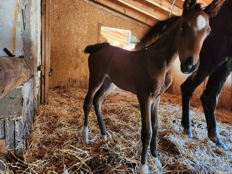 Hermosa y grande yegua castaña en venta con potra. Madre de Jazz x Don Primair (Élite, deporte, prok.). Compite en PSG pero se vende como yegua de cría junto con su potra de Santano, con 4 patas blancas y mucha calidad.