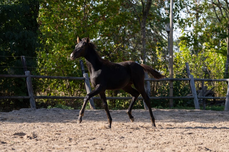 Very affectionate and well-behaved filly. Leads calmly on a halter. Recently trimmed, dewormed, and vaccinated. Comes from a strong German dam line. Mother is licensed and graded. The foal has correct conformation and good leg alignment. It has three correct gaits and moves smoothly with suppleness. Certainly a foal with great potential for the future. The foal has been with its mother until 6 months of age and is now housed in a communal stable with three other mare foals. It is available immediately.