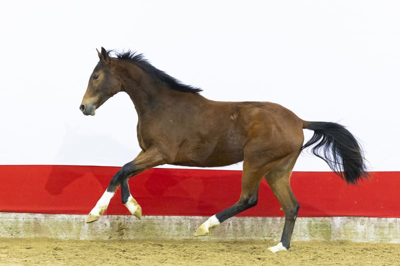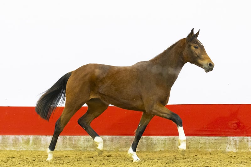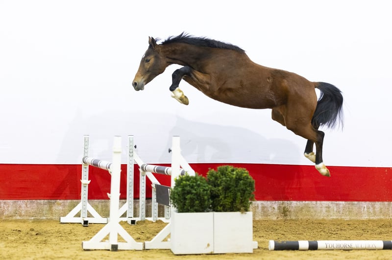 A horse with tremendous scope who already jumps with excellent style. She shows real power over the fence combined with very good technique. In her jumps you see balance, overview and natural reflex. She moves light-footed with a well-carried, powerful canter. Everything indicates quality and long-term potential. A modern sport horse with scope and technique.