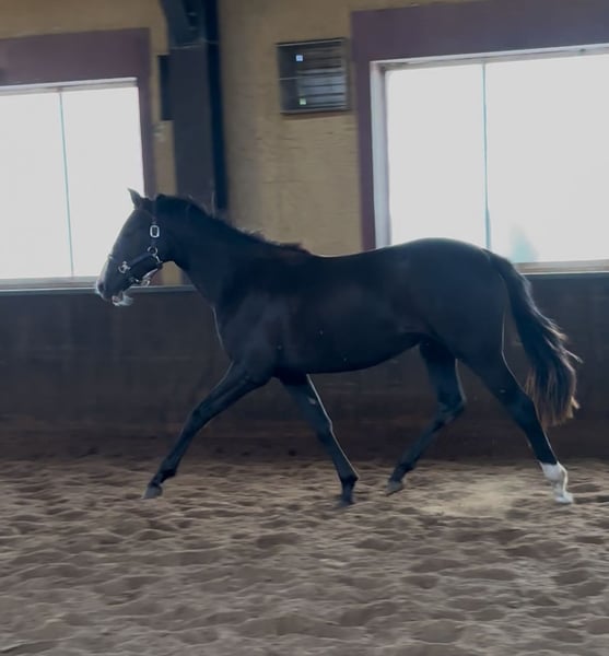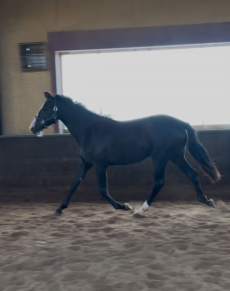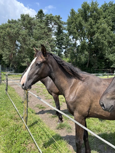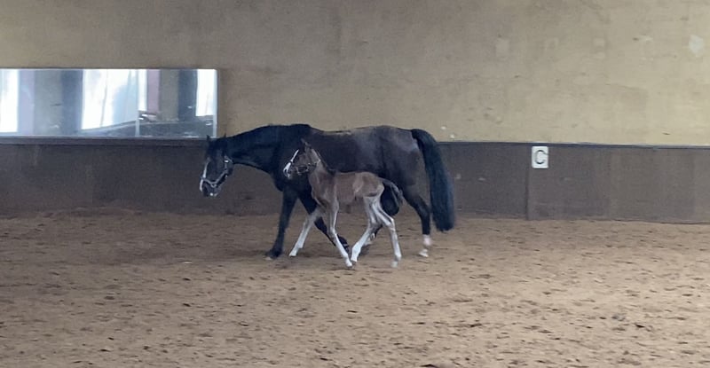 ⚜️ Maxi de Elegante foal ⚜️ Are you looking for a foal with charisma, quality, and character? Then meet our Maxi – an exceptionally beautiful and promising mare, born from a unique cross between the spirited Spanish 🇪🇸 blood of the PRE and the modern elegance of the 🇳🇱 KWPN warmblood. PRE stallions are renowned for their collectedness and can bring great expression and energy to modern dressage breeding. Their brave temperament is also inherited, positively influencing the offspring of crossbreeds. This stunning young lady is not only a real eye-catcher but also possesses everything needed for a successful future in sport and as a reliable partner. Vaccinations, deworming, and farrier work – no problem! Handled with halter and even comfortable with strangers. She is fully trusting of people. The best of both worlds – PRE x KWPN crossbreed KWPN mare, born on 20.03.2024, from Elegante de Millan III x Lombardi x Ultimo Expected final height: approximately 16.1 hh Our foals are kept outdoors 24/7 from birth, weather permitting. Numerous studies show that this is the foundation for a particularly strong horse. This makes them less prone to injuries later on, and tendons and bones become especially resilient. They grow up as a family – mares, colt foals, and fillies together – which greatly promotes their social development. Something many foals lack in their first months of life. Later, during rearing, they live in a mixed herd with horses of all ages, ensuring good upbringing through a clear hierarchy. This provides our foals with a strong foundation and the best possible start in life. They will benefit from this throughout their entire lives – and for future owners, it’s a significant advantage to have a horse with such a healthy and stable basis. Our foals are accustomed to various everyday noises shortly after birth: tractor, leaf blower, umbrella, brush cutter – everything that makes noise in daily life.