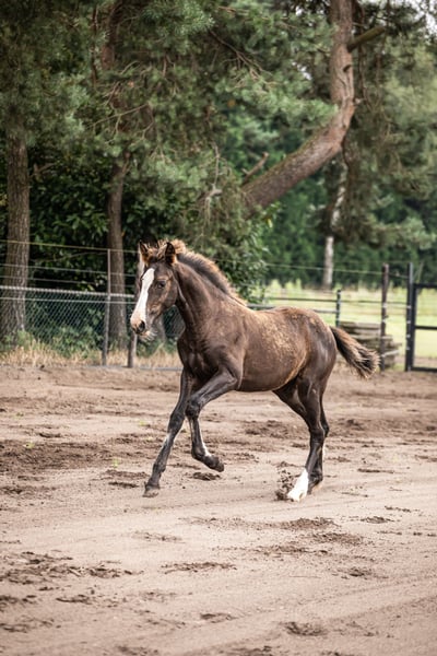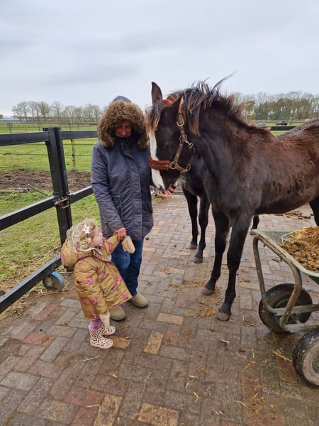 ⚜️ Uhreeste Maxi de Elegante ⚜️ Bent u op zoek naar een veulen met uitstraling, kwaliteit en karakter? Maak dan kennis met onze Maxi – een uitzonderlijk mooi en veelbelovend merrie, ontstaan uit een unieke kruising tussen het temperamentvolle Spaanse 🇪🇸 bloed van het PRE en de moderne elegantie van het 🇳🇱 KWPN warmbloed. PRE-hengsten staan bekend om hun verzameling en kunnen de moderne dressuurpaardenfokkerij enorme expressie en energie geven. Ook het moedige karakter wordt doorgegeven en heeft een zeer positieve invloed op de nakomelingen van de kruising. Deze adembenemende jonge dame is niet alleen een echte blikvanger, maar beschikt ook over alles wat je wenst voor een succesvolle toekomst in de sport en als betrouwbare partner. Vaccineren, ontwormen en hoefsmid – geen probleem! Halvervoer is ook mogelijk met onbekenden. Ze heeft volledig vertrouwen in mensen. Het beste uit twee werelden – kruising PRE x KWPN KWPN-merrie, geboren op 20-03-2024 uit Elegante de Millan III x Lombardi x Ultimo Verwachte eindhoogte: + 1,70 m Onze veulens staan – indien het weer het toelaat – vanaf de geboorte 24/7 buiten. Talrijke studies tonen aan dat dit de basis vormt voor een bijzonder sterk paard. Daardoor zijn ze later minder vatbaar voor blessures, en worden pezen en botten extra sterk. Ze groeien op als familie – merrie, hengst- en merrieveulens samen – wat hun sociale ontwikkeling enorm bevordert. Iets dat veel veulens in de eerste levensmaanden ontbreekt. Ook later in de opfok leven ze in een gemengde kudde met paarden van alle leeftijden, wat zorgt voor een goede opvoeding door een duidelijke hiërarchie. Zo krijgen onze veulens een stevige basis en de best mogelijke start in het leven. Daar zullen ze hun hele leven profijt van hebben – en voor toekomstige eigenaren is het een groot pluspunt om een paard te hebben met zo’n gezonde en stabiele basis. Onze veulens wennen al kort na de geboorte aan alles: tractor, bladblazer, paraplu, heggenschaar – alles wat lawaai maakt in het dagelijks leven.
