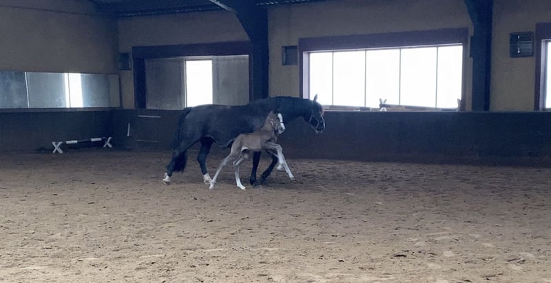 ⚜️ Uhreste Maxi de Elegante ⚜️ Are you looking for a foal with charisma, quality, and character? Then meet our Maxi – an exceptionally beautiful and promising mare, born from a unique cross between the spirited Spanish 🇪🇸 blood of the PRE and the modern elegance of the 🇳🇱 KWPN warmblood. PRE stallions are renowned for their expressive movement and can add tremendous presence and energy to modern dressage breeding. Their brave temperament is also inherited and has a highly positive influence on the offspring of crossbred breeding programs. This stunning young lady is not only a real eye-catcher but also possesses everything needed for a successful future in sport and as a reliable partner. Vaccinations, deworming, and farrier work – no problem! Halter-trained and comfortable around strangers. She is fully trusting of people. The best of both worlds – crossing PRE x KWPN KWPN mare, born March 20, 2024, out of Elegante de Millan III x Lombardi x Ultimo Expected final height: approximately 16.1 hh Our foals are kept outdoors 24/7 from birth whenever weather permits. Numerous studies show that this is the foundation for a particularly strong horse. It results in fewer injuries later on, and tendons and bones become especially resilient. They grow up as a family – mares, colts, and fillies together – which greatly promotes their social development. Something many foals lack in their first months of life. Later in their upbringing, they live in a mixed herd with horses of all ages, ensuring good socialization through a clear hierarchy. This gives our foals a solid foundation and the best possible start in life. They will benefit from this throughout their entire lives – and for future owners, it’s a significant advantage to have a horse with such a healthy and stable base. Our foals are introduced early to various everyday noises: tractor, leaf blower, umbrella, brush cutter – everything that makes noise in daily life.