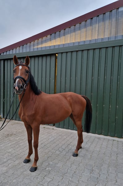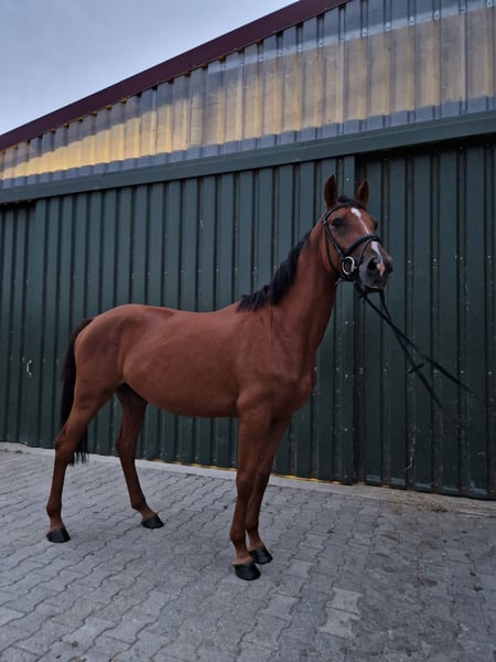 Zum Verkauf steht unsere 2021 geborene KWPN Stute, sie wurde im Mai diesen Jahres schonend anlongiert und anschließend angeritten und zeigte sich hierbei durchweg brav. Die Stute ist sehr umgänglich und gut erzogen, sei es beim Hufschmied, impfen oder im Alltag. Sie lässt sich zudem problemlos longieren und kennt Führmaschine sowie Hänger fahren. Unter dem Sattel will sie dem Reiter gefallen und macht erste Sprünge mit dem Reiter. Sie hat eine tolle Arbeitseinstellung und ein angenehmes "Go" und will es dem Reiter immer recht machen. Wir wünschen uns ein förderndes Zuhause, wo sie behutsam an der Sport herangeführt wird. Videos können gerne auf Anfrage gesendet werden, bei Fragen stehe ich zur Verfügung.