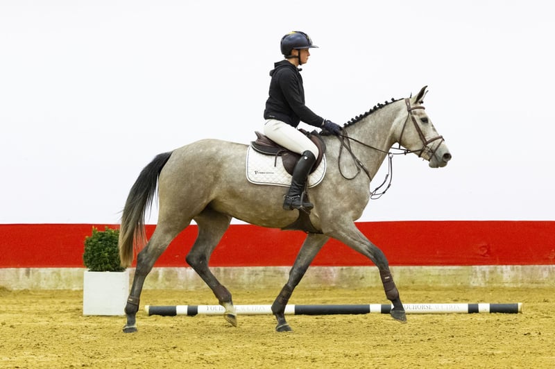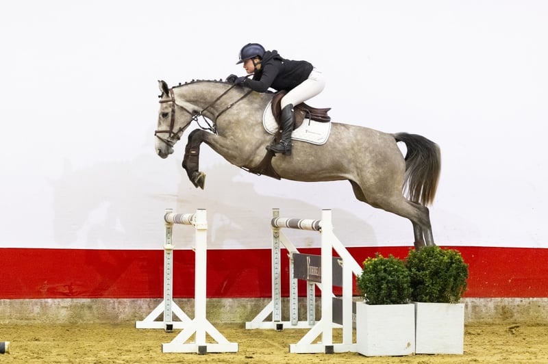 Beautiful grey, only four weeks under saddle. He has a good attitude and is already pleasant to ride. He takes everything on easily and stays relaxed in his body. Over the fences he is careful and jumps a bigger fence naturally. A young horse with quality and natural ability. Sire Ci Ci Senjor Ask (1.60m) is by Cassini I (1.60m) out of a Capitol I damline. He produced multiple 1.60m performers such as Ci Beau Ask, Cicci BJN and Senjor Catello. A proven Holsteiner sire line with scope and technique firmly anchored. Dam Nateusie-S (by Ducati van Schuttershof 1.55m) traces back to Arusa S (by Berlin 1.60m). From this direct line come several 1.45m–1.60m performers including Amareusa S, Oteusi, Illusion, New Mexico, Re Mexico, Jumping Jack ZF, India Blue ZF, Goteusi and Uterusa. Further down the damline through Ferusa (by Le Mexico) and Terusa (by Lucky Boy xx), this family consistently produces 1.45m–1.60m sport horses and approved stallions. A strong and proven performance line.