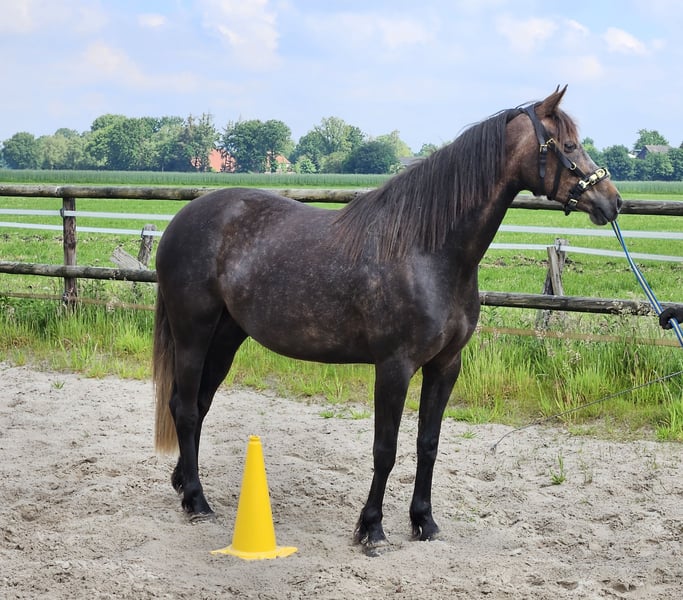 Biete hier meine wunderschöne "kleine" Stute zum Verkauf auf Grund gesundheitlicher und zeitlicher Probleme meinerseits. Schimmelchen, wie sie hier liebevoll genannt wird, ist jetzt diesen Sommer anlongiert, kennt Gurt, Sattel mit Bügeln, Kappzaum und Trense. Wir haben uns auch schon drübergelegt. Sie macht alles brav mit. Man könnte jetzt mit dem schonenden anreiten beginnen. Schimmelchen kennt auch Bodenarbeit, Stangen, Pylonen, etc. Sie ist selbstverständlich Schmiede und Verladefromm. Leichtfuttrig und keine Unarten. Gesund, geimpft und entwurmt. Sie ist hier im Herdenverband aufgewachsen und verträglich mit Stuten und Wallachen. Sie wurde wegen der Spätentwicklung (Spanier) erst in diesem Jahr angefangen. Sehr gut könnte ich sie mir bei Disziplinen wie z.B. Equitation Working vorstellen, dieses war eigentlich mein Ziel. Wenn Sie die kleine kennen lernen möchten gerne melden. Ich wünsche mir für sie ein schönes zu Hause auf Lebenszeit. Videos von der Arbeit gerne bei ernsthaften Interesse Halbschwester im Sport erfolgreich Springen A-L, Dressur A Schimmelchen ist ein Kind der Liebe und hat deswegen "nur" einen Pass. War mir persönlich egal, da man auf den Papieren