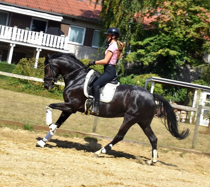 5-jährige Stute (166 cm), die als vielversprechender Dressurnachwuchs durch ihre Ausstrahlung und Präsenz besticht. 📌 Ausbildungsstand Dressurpferde A Sowohl in der Halle als auch auf dem Außenplatz zuverlässig geritten Geländesicher – alleine wie auch in der Gruppe Stabile Grundausbildung und bereit für die weitere sportliche Förderung Mit ihrem menschenfreundlichen, ehrlichen Wesen zeigt sie sich im täglichen Umgang stets angenehm und unkompliziert. 📑 Gesundheit Umfangreiche klinische Ankaufsuntersuchung aus der Pferdeklinik liegt vor Röntgenbilder (Beine, Hals, Genick) vorhanden – ohne Befund Für diese besondere Stute wünschen wir uns ein liebevolles 5-Sterne-Zuhause. Probereiten berechnen wir mit 40Euro die beim Kauf selbstverständlich verrechnet