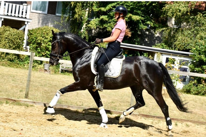 5-jährige Stute (166 cm), die als vielversprechender Dressurnachwuchs durch ihre Ausstrahlung und Präsenz besticht. 📌 Ausbildungsstand Dressurpferde A Sowohl in der Halle als auch auf dem Außenplatz zuverlässig geritten Geländesicher – alleine wie auch in der Gruppe Stabile Grundausbildung und bereit für die weitere sportliche Förderung Mit ihrem menschenfreundlichen, ehrlichen Wesen zeigt sie sich im täglichen Umgang stets angenehm und unkompliziert. 📑 Gesundheit Umfangreiche klinische Ankaufsuntersuchung aus der Pferdeklinik liegt vor Röntgenbilder (Beine, Hals, Genick) vorhanden – ohne Befund Für diese besondere Stute wünschen wir uns ein liebevolles 5-Sterne-Zuhause. Probereiten berechnen wir mit 40Euro die beim Kauf selbstverständlich verrechnet