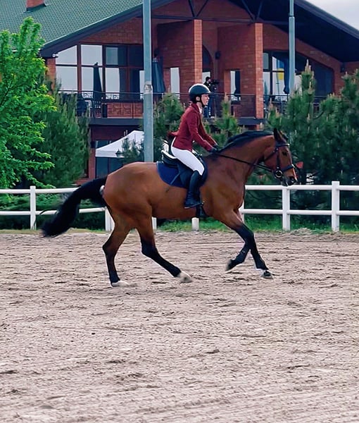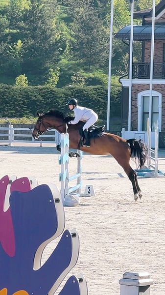 Talented young mare with jumping experience 110 cm on competitions and 120 at home. Absolutely brave, easy to ride. Clear X-rays. Based in Lviv.