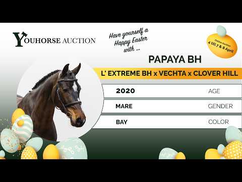 Papaya is een mooie, bloedgemaakte merrie met een lichtvoetige galop en een fijne manier van bewegen. Ze springt met veel kwaliteit, heeft een goede techniek en is voorzichtig op de sprong. Ze is heel fijn te rijden, meewerkend en heeft een goed karakter. Een paard dat alles met veel gemak doet en zich prettig laat bewerken door de ruiter. Ze heeft ervaring op 1.10m niveau. Als vierjarige heeft ze een veulen gehad en is nu ongeveer een jaar onder het zadel. Ze is nog wat groen, maar toont veel aanleg en kwaliteit voor de toekomst. Wel is ze op het voorterrein en bij het losrijden soms wat bang van andere paarden. Dit vraagt in het begin wat management en gewenning. Met een consequente aanpak zal dit zich op een goede manier ontwikkelen. Dit zie je vaker bij paarden die scherp zijn op de sprong en met gewenning wordt dit normaal gesproken beter. Vader L’Extreme BH springt op 1.35m niveau en is een zoon van Grand Prix-hengst Canturo (1.60m). Uit deze lijn komen ook Shou d’Ouilly (1.50m) en Osiris d’Ouilly (1.55m), wat het vermogen bevestigt. Moeder Billy Buttercup sprong op 1.40m niveau. De moederlijn is zeer sterk en brengt meerdere internationale springpaarden: Billy Congo (1.60m, goedgekeurde hengst) Billy Orange (1.60m) Billy Autumn (1.60m) Billy Santorini (1.60m) Billy Alpen (1.55m) Billy Utah (1.45m) Strides Foxy Lady (1.45m) Billy Holly Blue (1.40m) Billy Skipper (1.40m) Billy Buttercup (1.40m) Billy Rhodes (1.35m) meerdere paarden op 1.30m niveau Een stam die zich ruimschoots bewezen heeft op het hoogste niveau.
