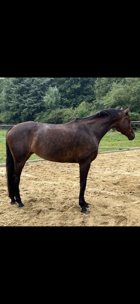 Beautiful, fine mare for sale as a young horse for eventing, dressage, or as a top all-rounder. Won dressage classes L and A, placed in L dressage, eventing L, show jumping L, and combined L. Very nice to ride, started in dressage training towards M. Super calm even in unfamiliar surroundings for trail riding, knows everything: bridges, through the city and along the road, tractors, wild dogs, cows, chickens, llamas, sheep, etc. Excellent to handle. Loads alone and goes to competitions alone, no problem at all. Therefore also absolutely suitable for hunting or a trail ride. Healthy and well cared for, from a great upbringing with plenty of movement. X-ray images from the end of 2 years old are available with no findings. If interested, please contact by phone only and not via the contact form.