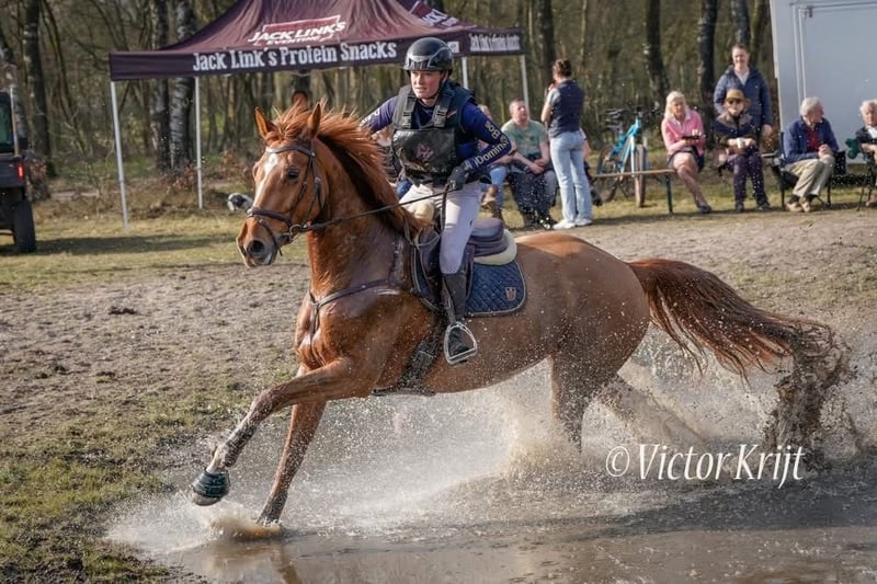 The perfect junior horse! Unfortunately, due to having to make some difficult choices, we are offering our sweetest mare for sale. Olivianne is a 6-year-old mare by Gemini XX x Zapatero VDL. We have trained her ourselves since she was 4, and we can say with certainty that she is the kindest horse ever. She is incredibly honest, always willing to work, very level-headed, and suitable for any rider. She always puts a smile on your face—she’s simply a joy to ride! Olivianne is competing at M1 dressage, 1.20m showjumping, and recently 2 eventing*. In the 1* she has been placed almost every time. She consistently scores 66%–72% in dressage, and she is very brave in the cross-country phase. You can ride her in all disciplines with a simple bit, without spurs; she is responsive to the leg and not spooky at all. She will always take her rider safely to the other side! She is also very suitable for the transition from pony to horse. She shows no “mare behaviour” whatsoever and is very social with both people and other horses. She recently passed a full vetting, including back and neck X-rays, and we have also recently had her tendons fully scanned—everything was completely clean. She is well-behaved for the farrier and vet, loads easily on both trailer and truck, and has no stable vices. A horse that will bring you an enormous amount of joy! For videos and more information, please send a WhatsApp message or call + 31 (0)6-13742234. Price indication: 55k+