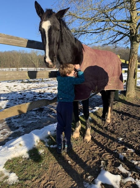 Leuke fokmerrie met goede afstamming. Beheerst de oefeningen tot Z, was elk jaar geselecteerd voor nationaal kampioenschap (LRV + jonge paarden). Blonk vooral uit door evenwicht en aanleg tot verzamelen. Op 3 jaar volledig RX en klinisch gekeurd zonder opmerking. Heeft ook een OCD predikaat. Absoluut niet kijkerig, maakte graag een spong, wandelen in groep en alleen, door water etc. Eenvoudig in de omgang en erg mensgericht. Staat bij ons in de kudde buiten. KAN NA WEIDE ACCIDENT (val) NIET MEER BEREDEN WORDEN. Werkte tijdens revalidatie 6 maanden in tuig aan de lange lijnen (ook met sleep) zonder problemen. Kent aan de lange lijnen en in de hand alle dressuuroefeningen. Momenteel vol (was vlot van eerste keer vol), het veulen blijft bij ons. De merrie kan weg na het spenen. Kan bij ons opnieuw gedekt worden. Weg wegens overtal. Enkel naar een goede thuis, geen handelaar.