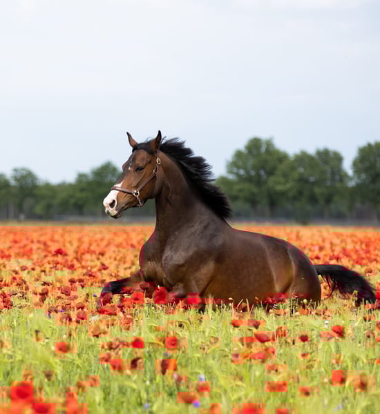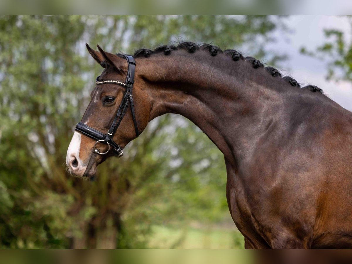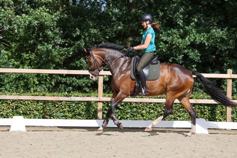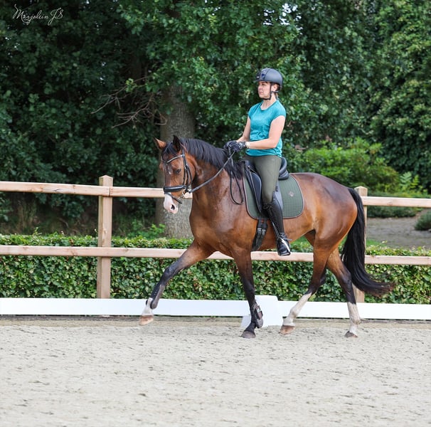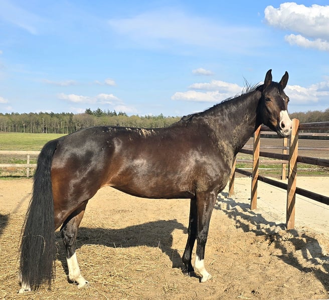 Stunning dark bay elite IBOP-prok D-OC mare Height: 1.70 m Sired by James Bond x G Ramiro Z KWPN registered Very strong sport-oriented dam line Specializes in dressage This sweet mare is more phlegmatic than excitable or sensitive. She is easy to load onto the trailer and enjoys competing. Whether in the arena or along the road, she is well-behaved and completely traffic-safe, happily joining rides in the forest alone or in a group. She has competed successfully in M-level dressage, performing with ease. She possesses three lovely gaits and offers exceptional ease in lateral movements, currently being trained towards Z-level. She takes simple flying changes very easily. She is also well-behaved with a rider who is still gaining experience and has not put a foot wrong. She jumps confidently up to 1 meter and seems to enjoy it greatly, whether over standard or natural obstacles. She clearly thrives on variety in training and would also make a versatile all-rounder. Multiple videos and additional information available via WhatsApp. +31 652 539 025 (speaking Dutch, German, and English)