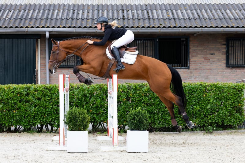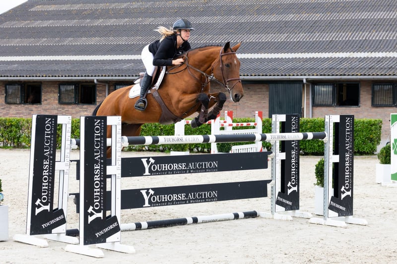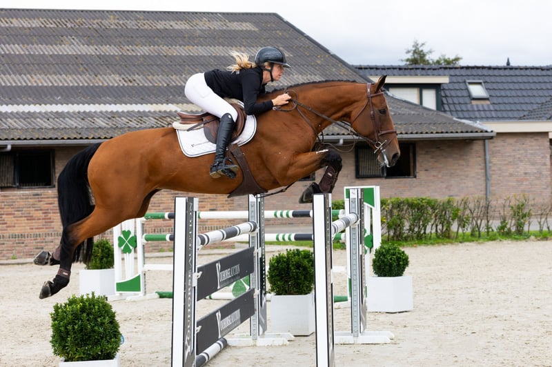 Bred for dressage, but she can jump as well! The nine-year-old Lady Latoya is classified Z2 dressage and competes at international 1.30m level. She starts a little stiff, but feels nice after a few jumps. She likes a rider who supports her a bit with the leg. Lady Latoya is neatly careful and has neat scope. Sire All At Once is a Grand Prix dressage stallion, as is grandsire OO Seven.